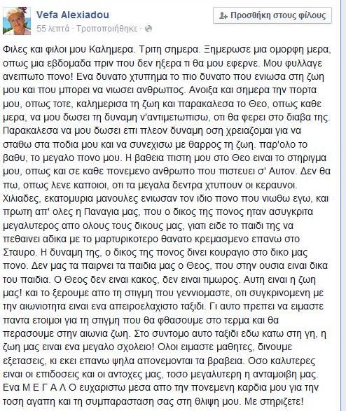 “Φίλες και φίλοι μου Καλημέρα. Τρίτη σήμερα. Ξημέρωσε μια όμορφη μέρα, όπως μια εβδομάδα πριν που δεν ήξερα τι θα μου έφερνε. Μου φύλαγε ανείπωτο πόνο! Ένα δυνατό χτύπημα, το πιο δυνατό που ένιωσα στη ζωή μου και που μπορεί να νιώσει άνθρωπος. Άνοιξα και σήμερα την πόρτα μου, όπως τότε, καλημέρισα τη ζωή καιπαρακάλεσα το Θεό, όπως κάθε μέρα, να μου δώσει τη δύναμη ν ‘αντιμετωπίσω, οτι θα φέρει στο διάβα της.Παρακάλεσα να μου δώσει επιπλέον δύναμη όση χρειάζομαι για να σταθώ στα πόδια μου και να συνεχίσω με θάρρος τη ζωή. Παρ’ όλο το βαθύ, το μεγάλο πόνο μου. Η βαθιά πίστη μου στο Θεό είναι το στήριγμα μου, όπως και σε κάθε πονεμένο άνθρωπο που πιστεύει σ’ Αυτόν. Δεν θα πω, όπως λένε κάποιοι, οτι τα μεγάλα δέντρα χτυπούν οι κεραυνοί.