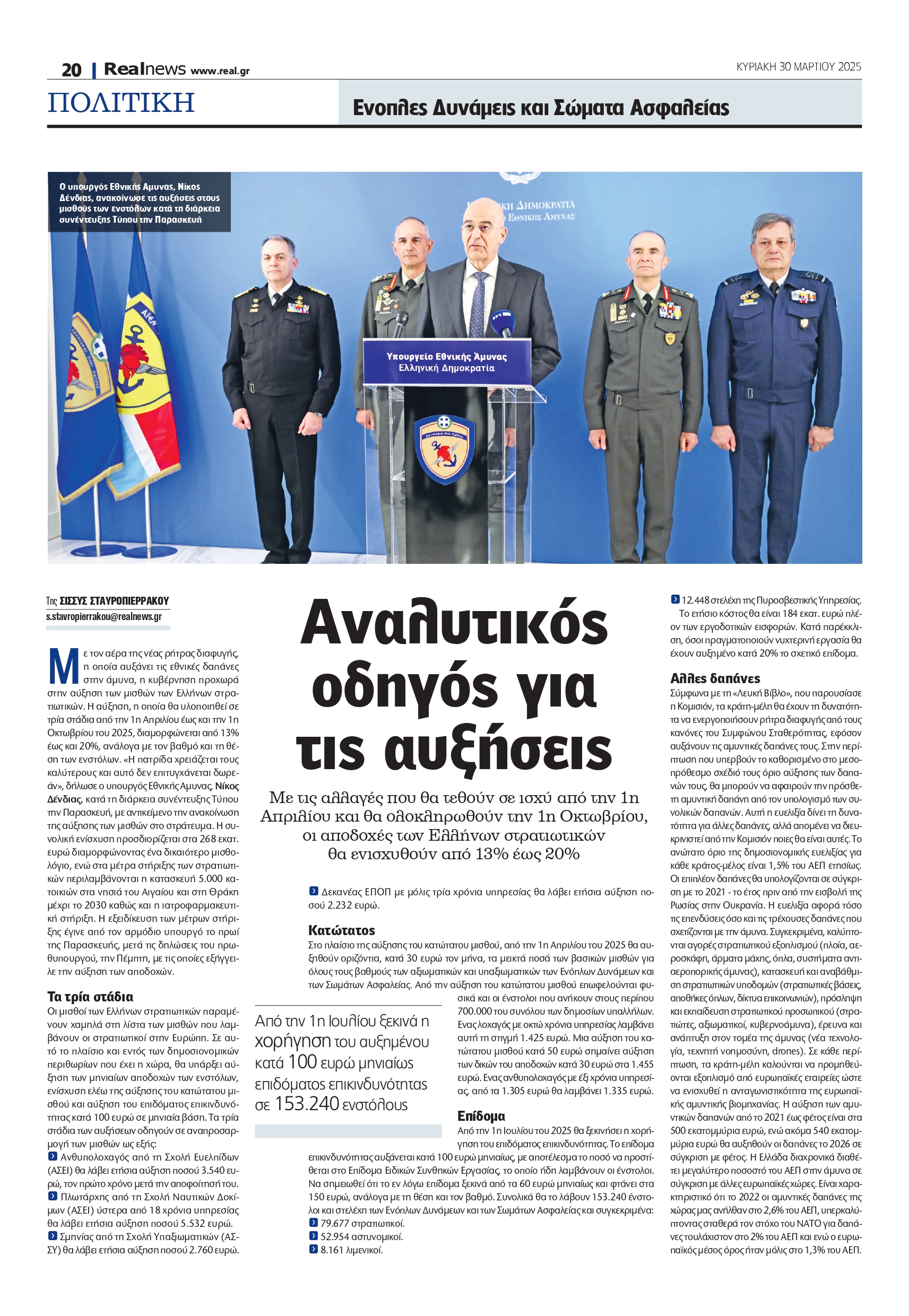 Mε τον αέρα της νέας ρήτρας διαφυγής, η οποία αυξάνει τις εθνικές δαπάνες στην άμυνα, η κυβέρνηση προχωρά στην αύξηση των μισθών των Ελλήνων στρατιωτικών. Η αύξηση, η οποία θα υλοποιηθεί σε τρία στάδια από την 1η Απριλίου έως και την 1η Οκτωβρίου του 2025, διαμορφώνεται από 13% έως και 20%, ανάλογα με τον βαθμό και τη θέση των ενστόλων.