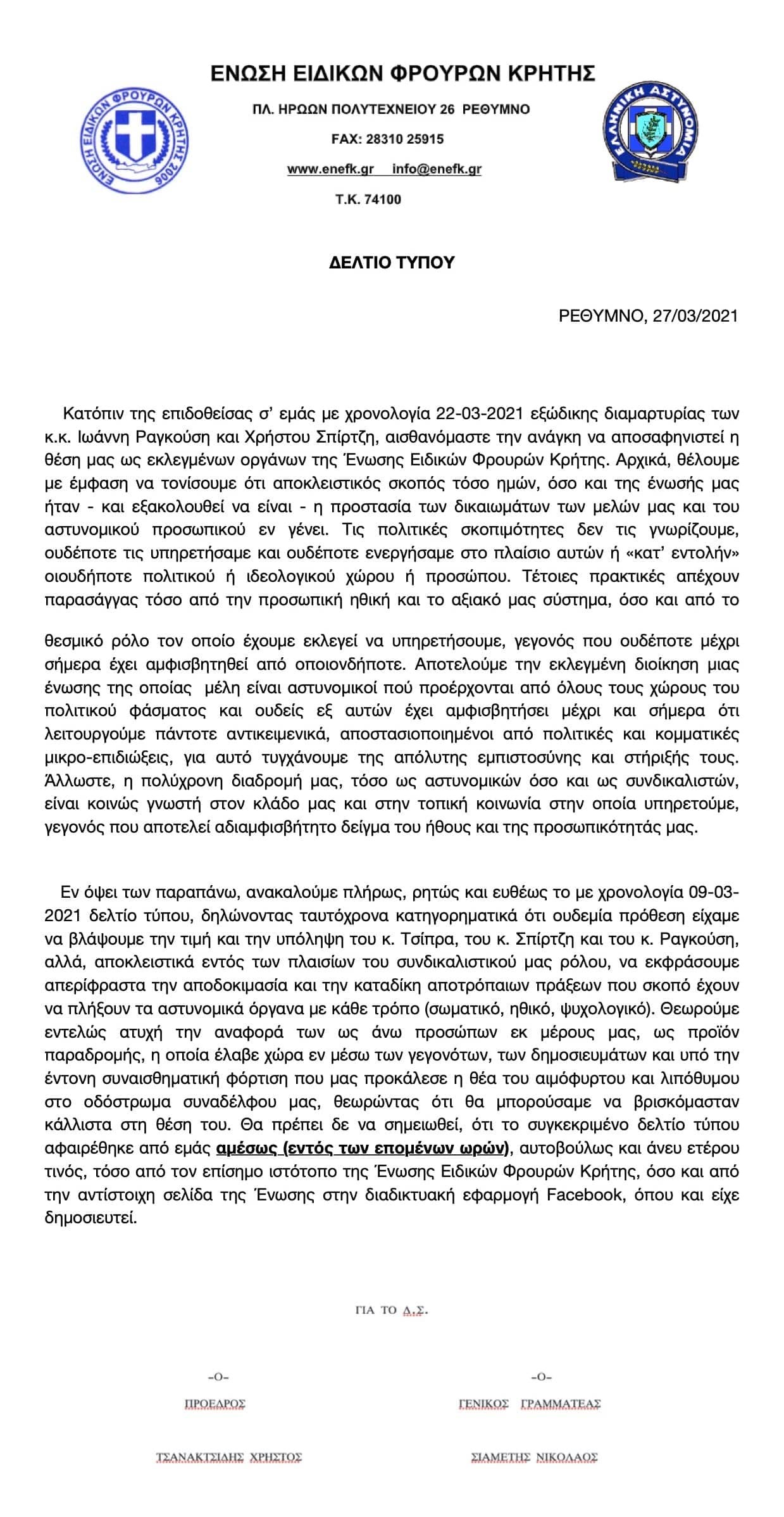 Εν όψει των παραπάνω, ανακαλούμε πλήρως, ρητώς και ευθέως το με χρονολογία 09-03-2021 δελτίο τύπου, δηλώνοντας ταυτόχρονα κατηγορηματικά ότι ουδεμία πρόθεση είχαμε να βλάψουμε την τιμή και την υπόληψη του κ. Τσίπρα, του κ. Σπίρτζη και του κ. Ραγκούση, αλλά, αποκλειστικά εντός των πλαισίων του συνδικαλιστικού μας ρόλου, να εκφράσουμε απερίφραστα την αποδοκιμασία και την καταδίκη αποτρόπαιων πράξεων που σκοπό έχουν να πλήξουν τα αστυνομικά όργανα με κάθε τρόπο (σωματικό, ηθικό, ψυχολογικό). Θεωρούμε εντελώς ατυχή την αναφορά των ως άνω προσώπων εκ μέρους μας, ως προϊόν παραδρομής, η οποία έλαβε χώρα εν μέσω των γεγονότων, των δημοσιευμάτων και υπό την έντονη συναισθηματική φόρτιση που μας προκάλεσε η θέα του αιμόφυρτου και λιπόθυμου στο οδόστρωμα συναδέλφου μας, θεωρώντας ότι θα μπορούσαμε να βρισκόμασταν κάλλιστα στη θέση του. Θα πρέπει δε να σημειωθεί, ότι το συγκεκριμένο δελτίο τύπου αφαιρέθηκε από εμάς αμέσως (εντός των επομένων ωρών), αυτοβούλως και άνευ ετέρου τινός, τόσο από τον επίσημο ιστότοπο της Ένωσης Ειδικών Φρουρών Κρήτης, όσο και από την αντίστοιχη σελίδα της Ένωσης στην διαδικτυακή εφαρμογή Facebook, όπου και είχε δημοσιευτεί.