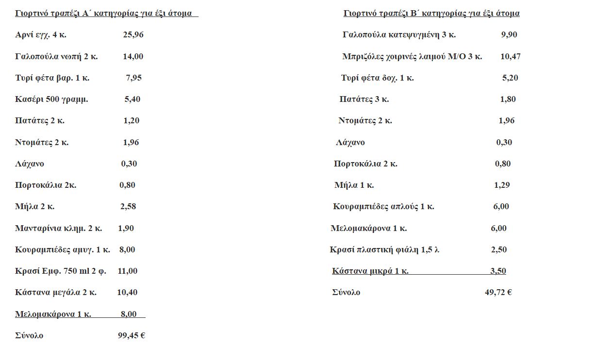 Η Ένωση Καταναλωτών Ελλάδας κάνει λόγο για γιορτινό τραπέζει δύο ταχυτήτων και κοστολόγησε την δαπάνη ως εξής:
