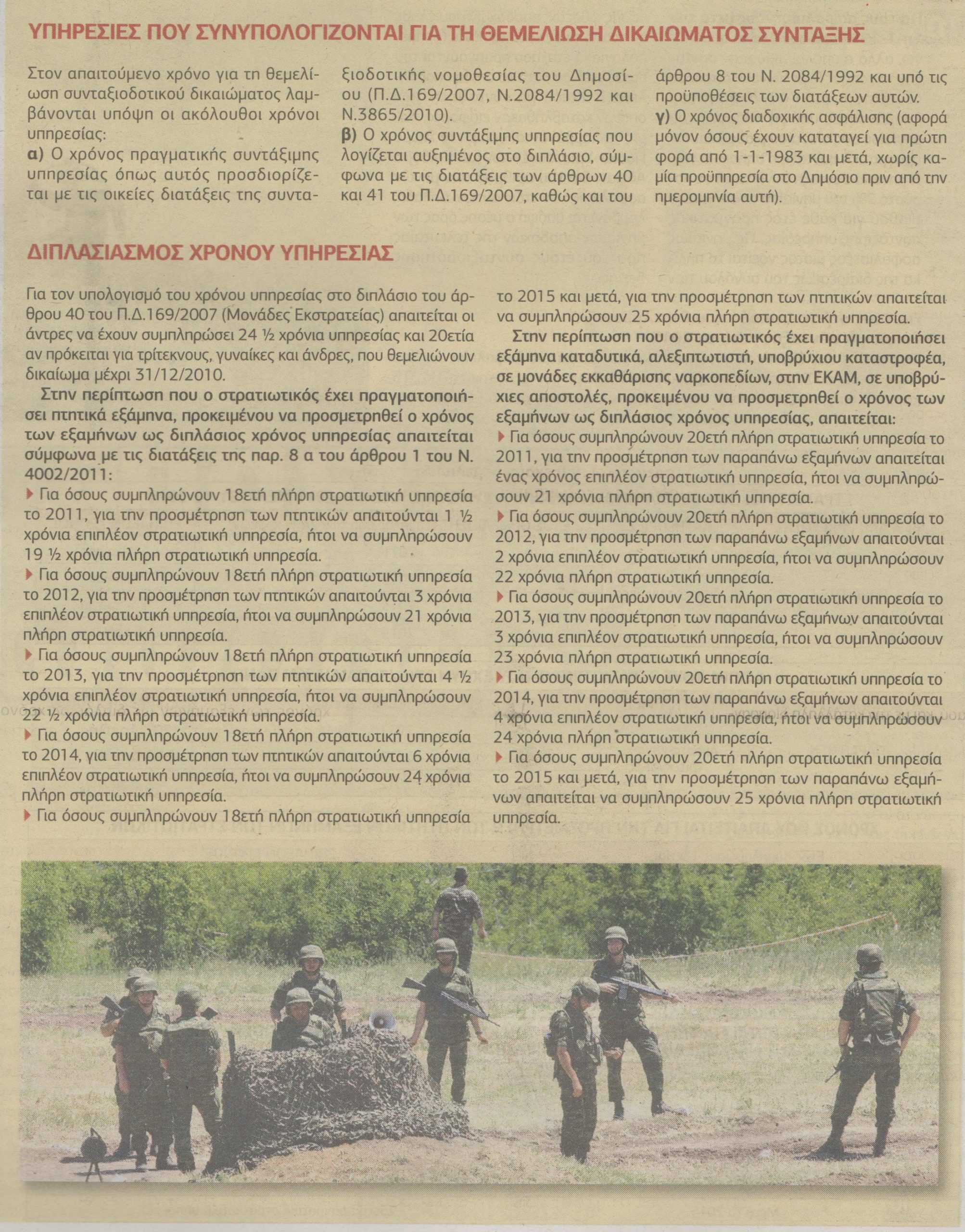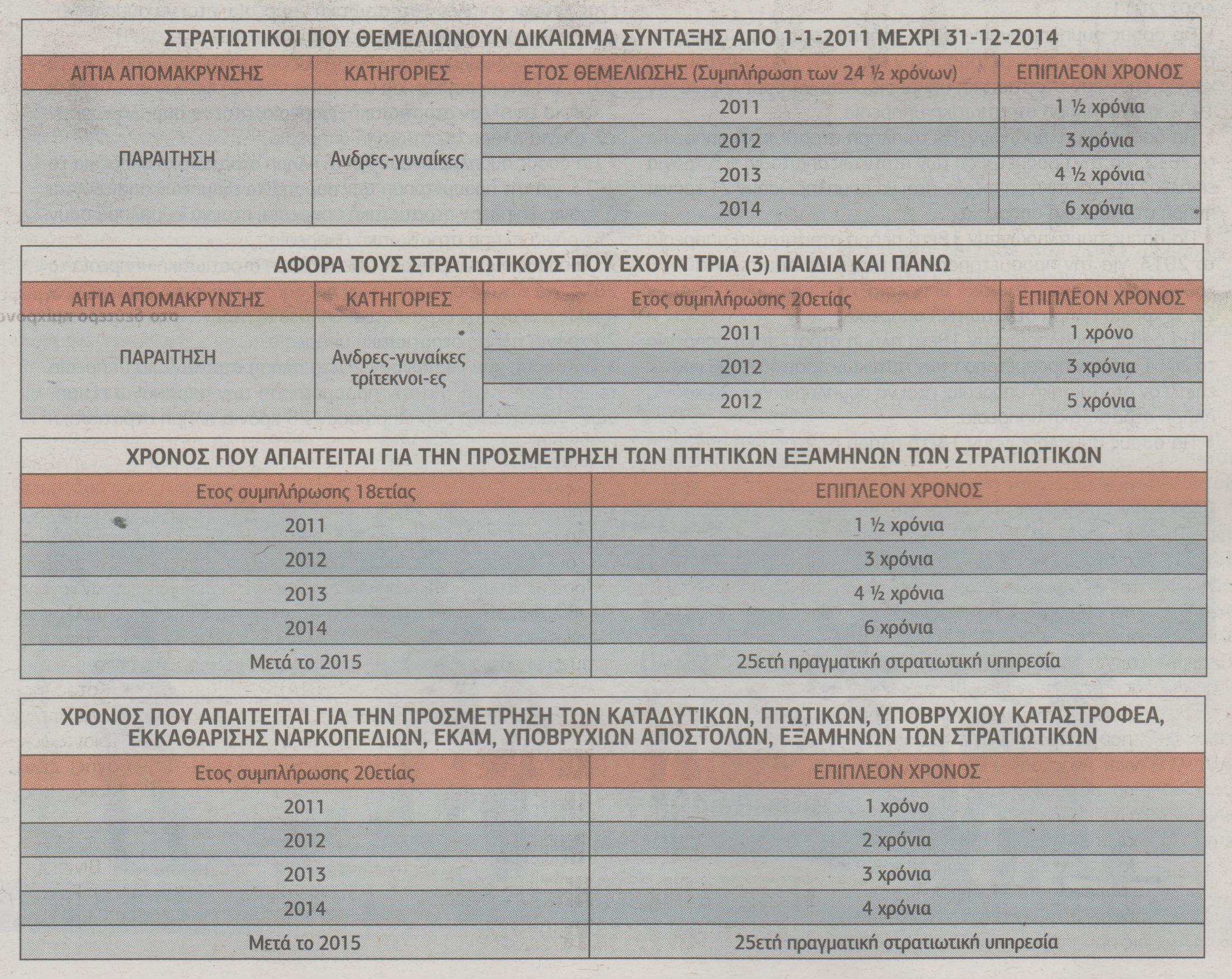 Σύνταξη με βασική προϋπόθεση να έχουν συμπληρωθεί 24,5 έτη υπηρεσίας κατοχυρώνουν οι αξιωματικοί και υπαξιωματικοί που υπηρετούν στις Ένοπλες Δυνάμεις, (Στρατό Ξηράς, Πολεμικό Ναυτικό, Πολεμική Αεροπορία) στα Σώματα Ασφαλείας (αστυνομικοί, λιμενικοί) και στο Πυροσβεστικό Σώμα.