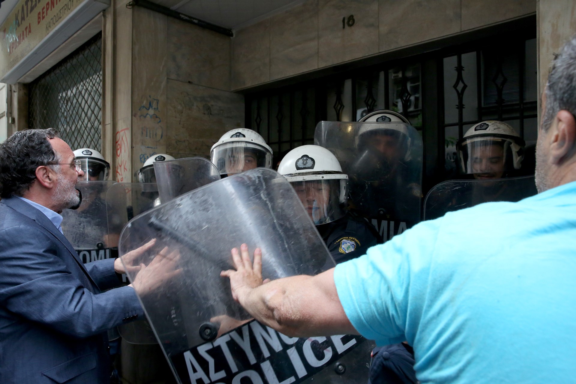 Ένταση επικράτησε σε συγκέντρωση διαμαρτυρίας που πραγματοποίησε η Λαϊκή Ενότητα έξω από συμβολαιογραφείο στο κέντρο της Αθήνας, ενάντια στους πλειστηριασμούς.