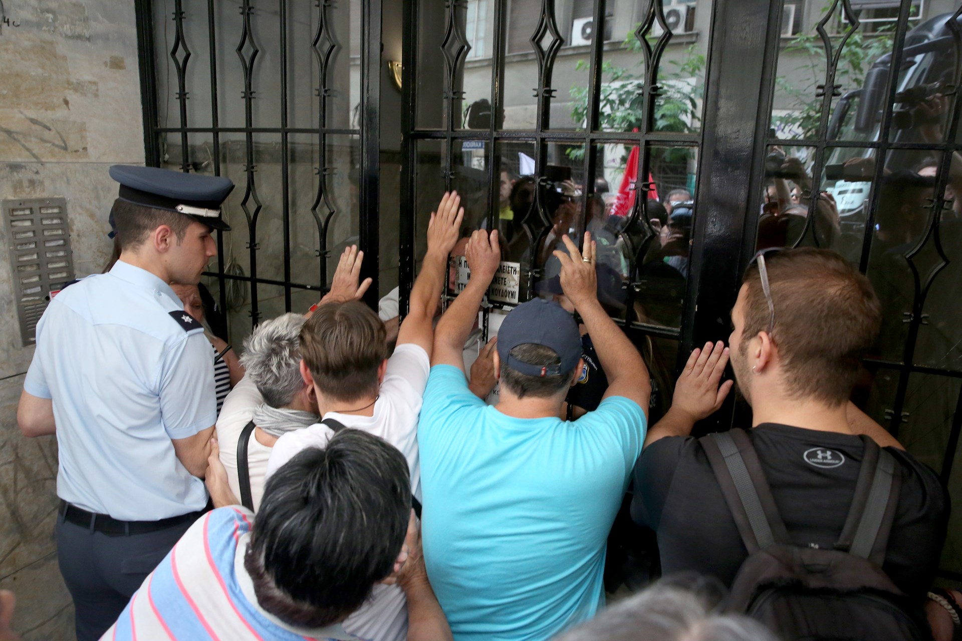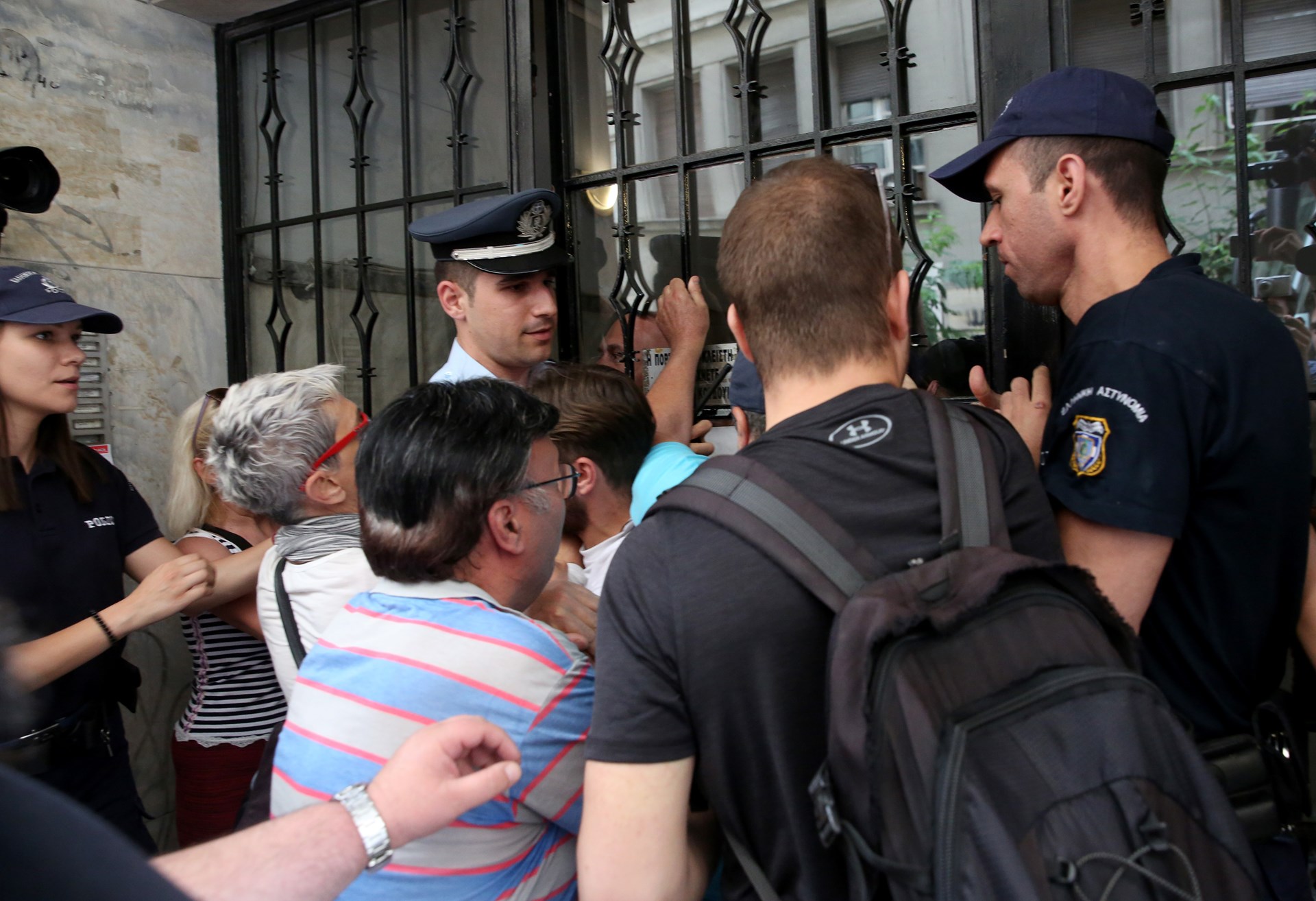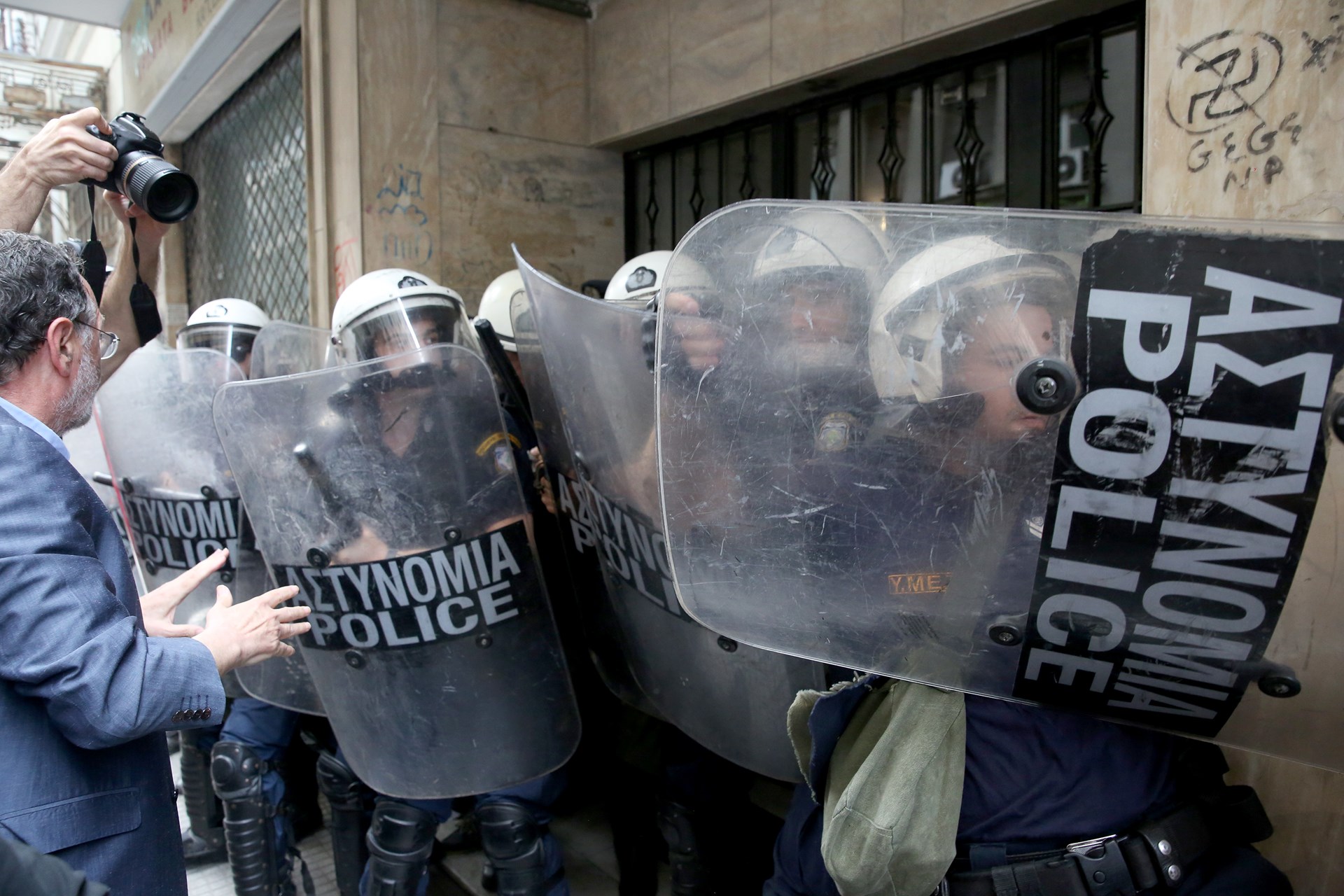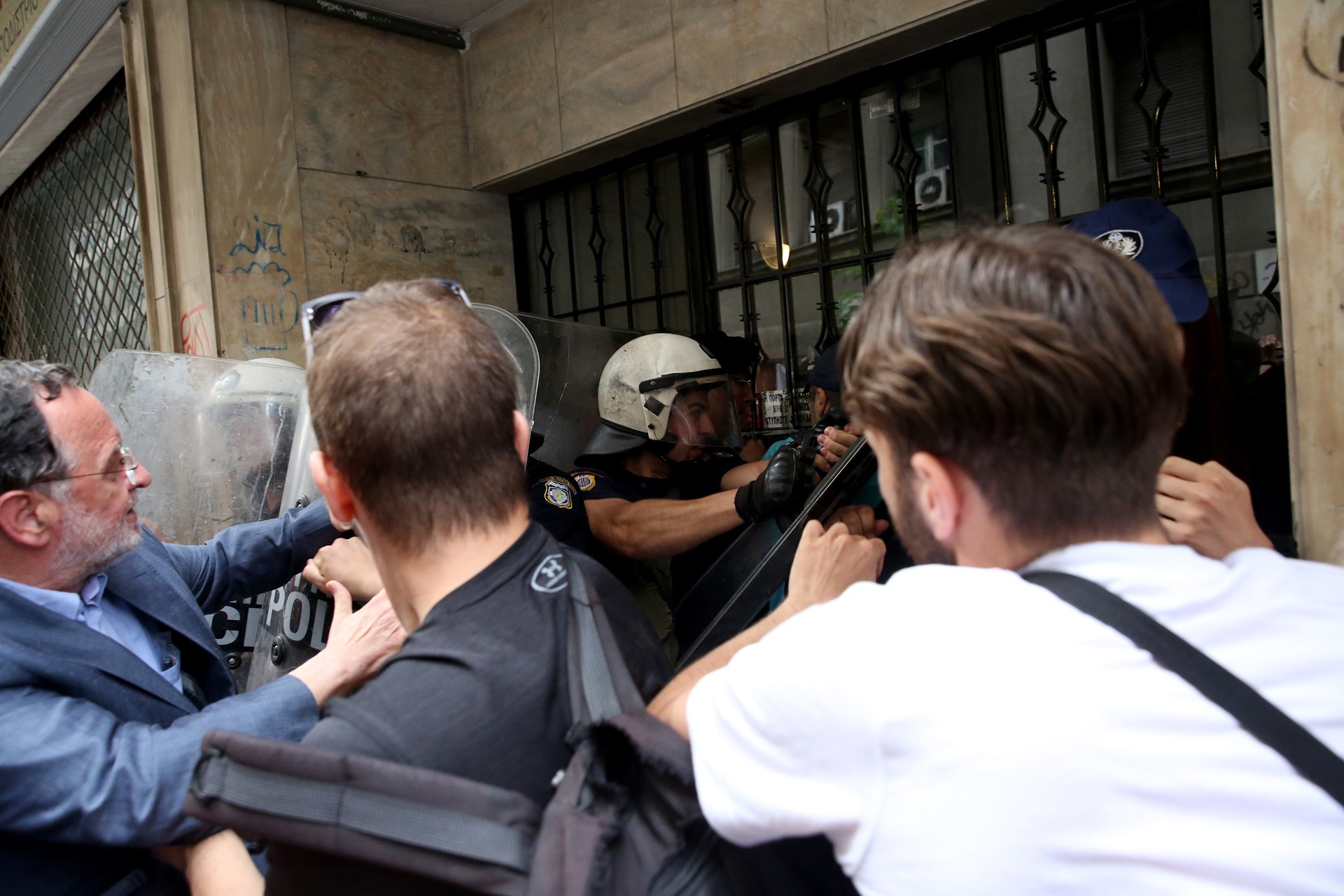 Μερίδα των διαδηλωτών προσπάθησε να εισβάλει το εσωτερικό του κτιρίου, ωστόσο οι δυνάμεις των ΜΑΤ τούς απώθησαν με τις ασπίδες.
