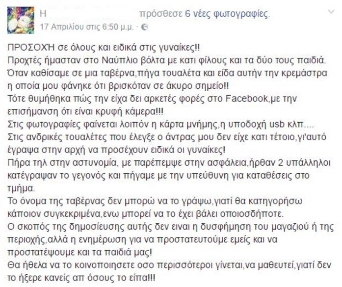 Η ανάρτηση μίας γυναίκας από το Ναύπλιο στον λογαριασμό της στο facebook, έχει προκαλέσει πανικό και κάνει τον γύρο του διαδικτύου.Η γυναίκα καταγγέλλει, ότι στην τουαλέτα μίας ταβέρνας στο Ναύπλιο, εντόπισε μία κρεμάστρα η οποία είχε ενσωματωμένη κρυφή κάμερα, και μάλιστα συνόδευσε την ανάρτησή της, με φωτογραφία του αντικειμένου.Η Αστυνομική Διεύθυνση Αργολίδας επιβεβαιώνει ότι έγινε καταγγελία από πελάτισσα εστιατορίου στο Ναύπλιο, ενώ η υπόθεση βρίσκεται στο στάδιο της προανάκρισης. Η δε κρεμάστρα έχει αποσταλεί στα εγκληματολογικά εργαστήρια της ΓΑΔΑ. Σύμφωνα με την αστυνομία, «εξετάζονται όλα τα ενδεχόμενα».Το ποιος την τοποθέτησε παραμένει άγνωστο, αλλά η πιθανότητα να την έχει εγκαταστήσει ο ιδιοκτήτης του καταστήματος είναι πολύ μικρή, αφού κανένας ιδιοκτήτης ταβέρνας δεν θα ρίσκαρε τόσο ανεύθυνα τη φήμη του.Η κάμερα «κρεμάστρα» διαθέτει κάρτα μνήμης, κάτι το οποίο σημαίνει ότι αν ο θύτης της είχε ενεργοποιημένη, δεν αποκλείεται να έχει καταγράψει και τον ίδιο τη στιγμή που την τοποθετούσε.