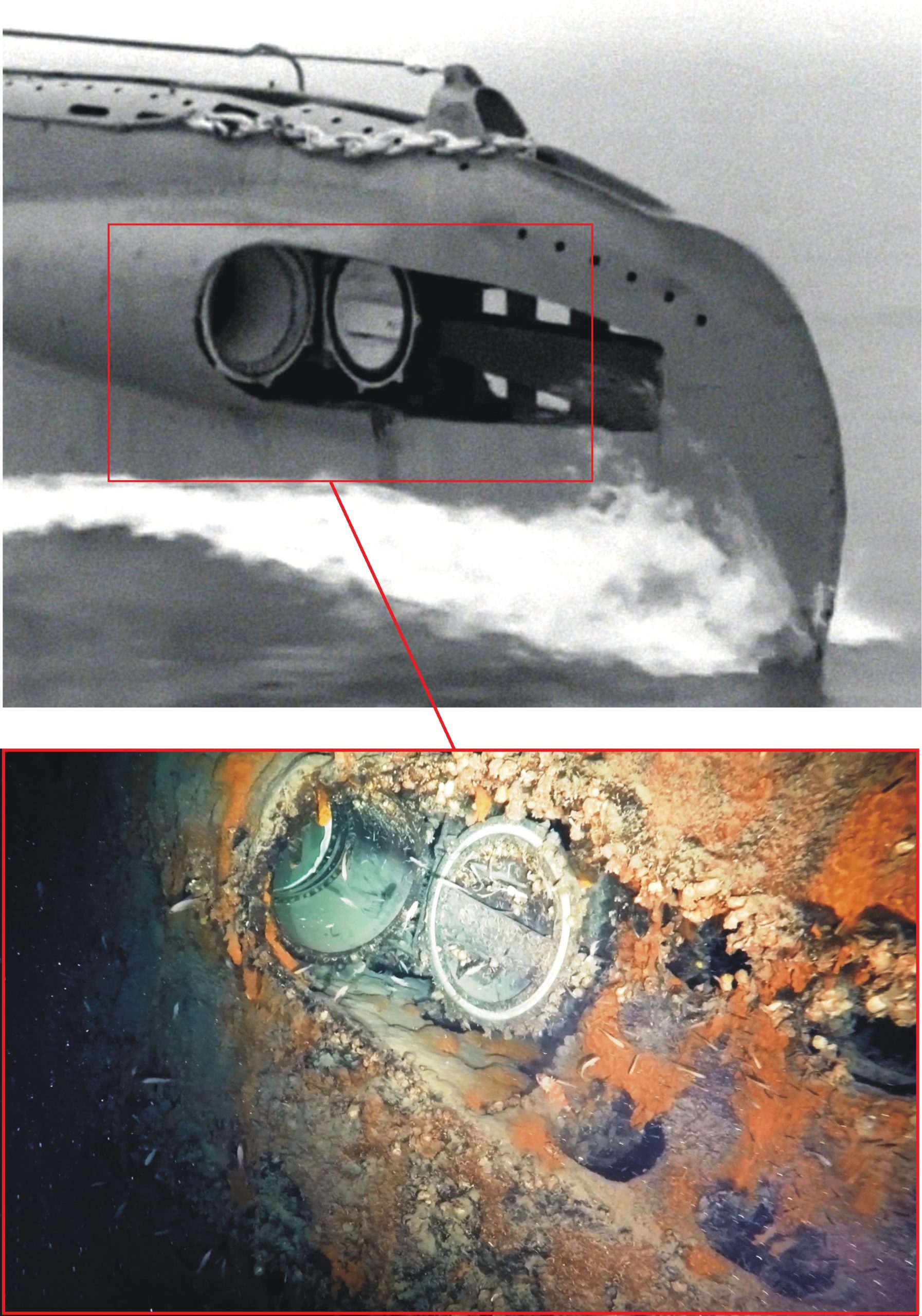 Η πλώρη έχει επικαθήσει στο βυθό με έμπρωρη διαγωγή (κλίση προς τα εμπρός) 5 μοιρών. Το πώμα της τορπιλοσωλήνας νούμερο 7 είναι ανοιχτό και η τορπίλη απουσιάζει. Τα πώματα των υπολοίπων τορπιλοσωλήνων είναι κλειστά.