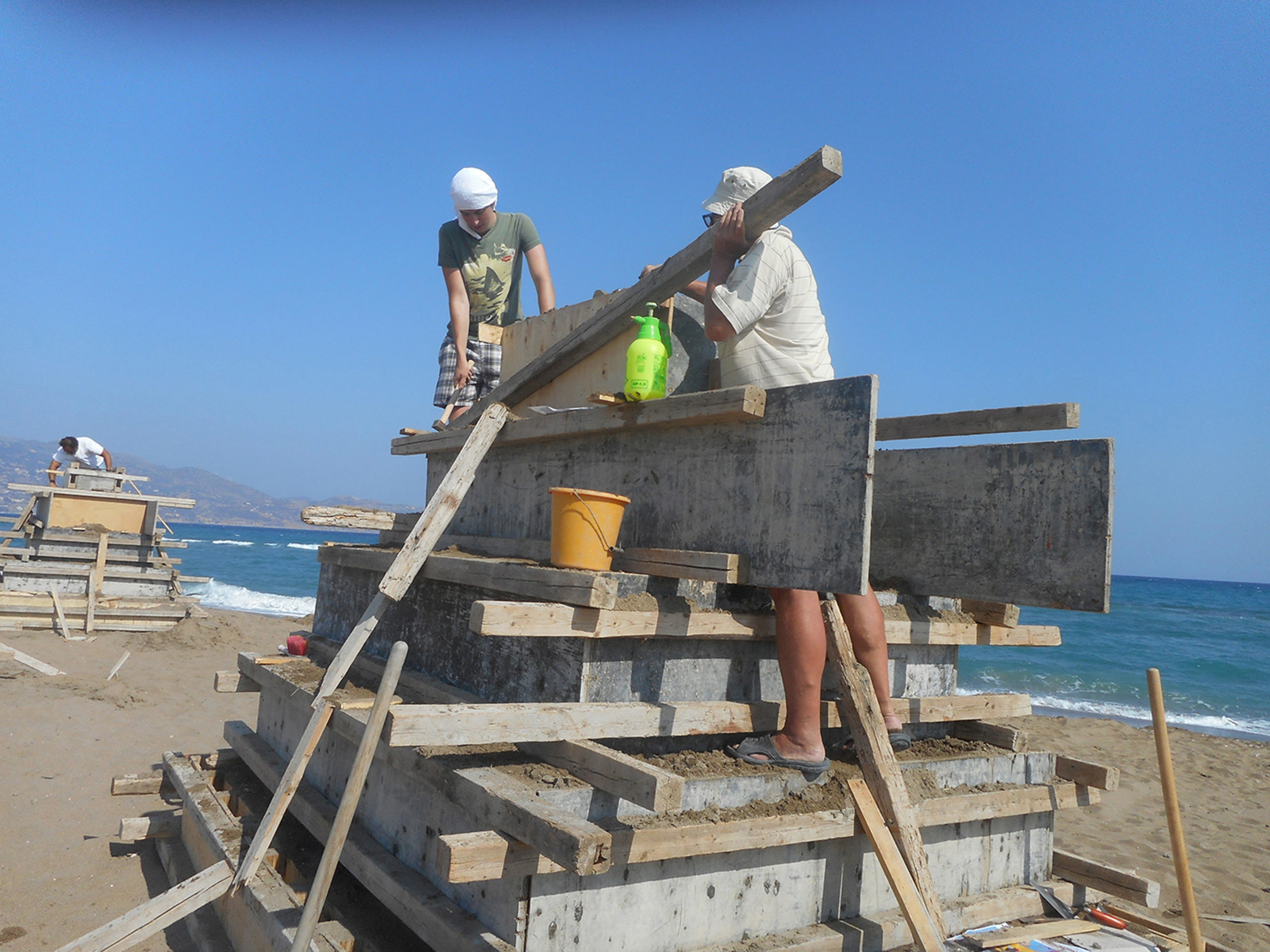 Οι γλύπτες Μανώλης Χαρκούτσης, ο Ουκρανός πανεπιστημιακός καθηγητής Γλυπτικής Yuriy Mysko και η διεθνώς αναγνωρισμένη γλύπτρια Lyudmyla Mysko, φιλοτεχνούν τα εντυπωσιακά γλυπτά τους, με θέμα τη θάλασσα και ειδικότερα τον Ποσειδώνα να φυσάει ένα πλεούμενο, μια Σειρήνα και ένα χταπόδι.