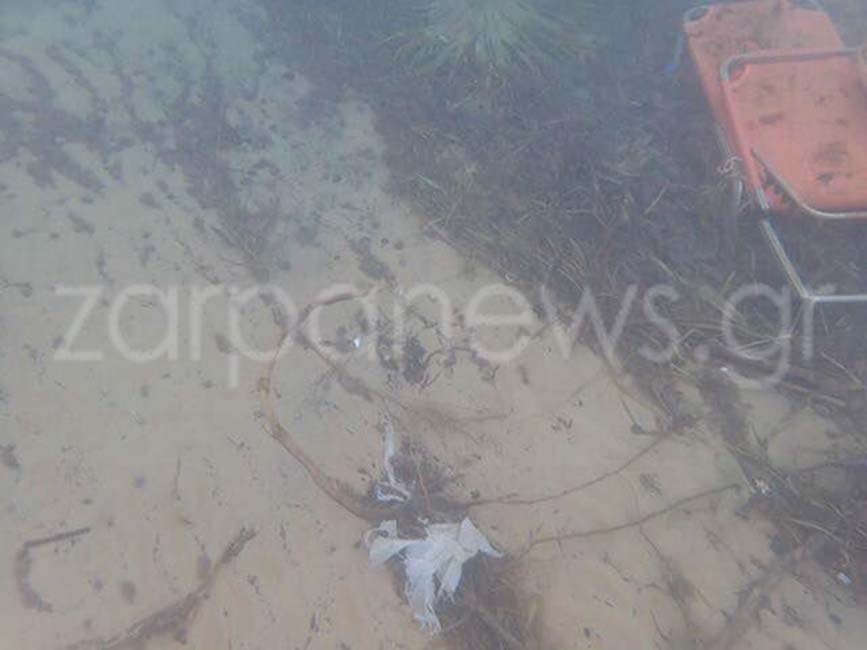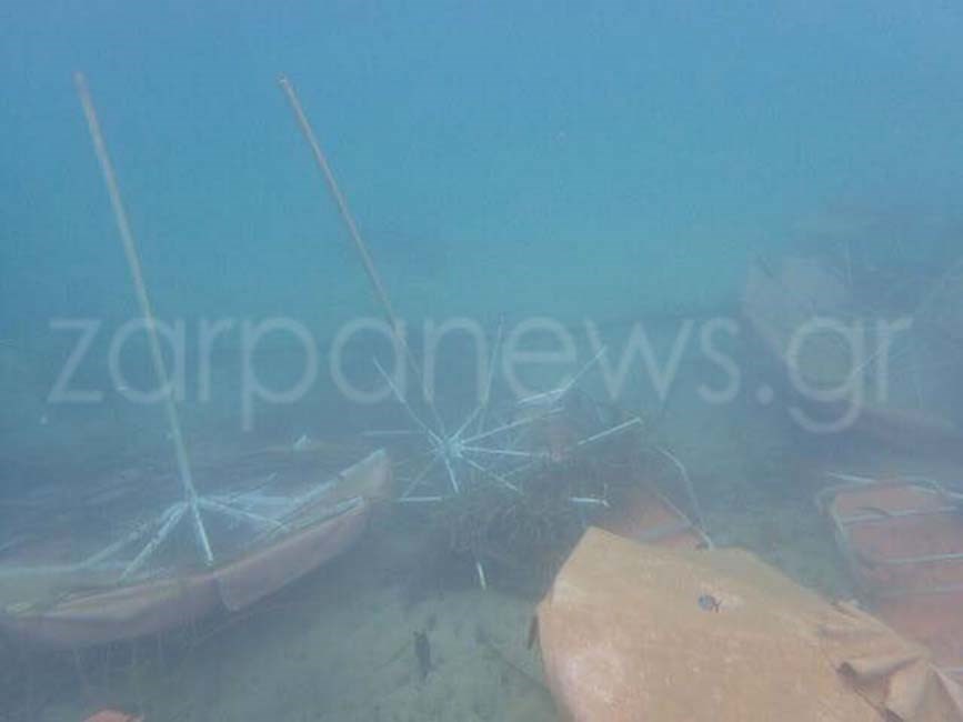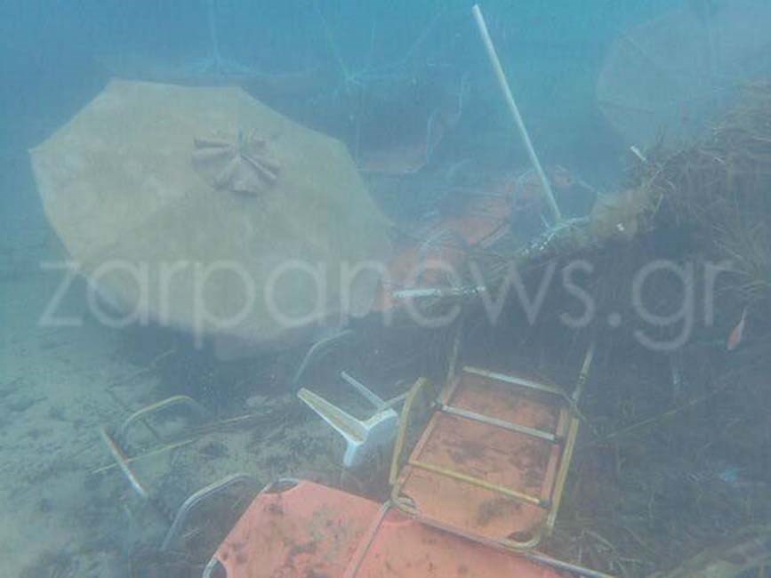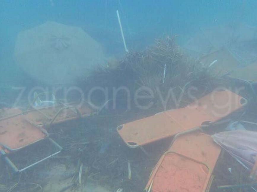 Τραπέζια, καρέκλες, ξαπλώστρες, ακόμα και ομπρέλες παραλίας, αποκάλυψε ο φωτογραφικός φακός δυτών, στο βυθό της παραλίας των Αγίων Αποστόλων στα Χανιά.
