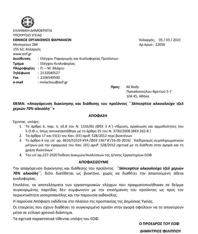Ο Εθνικός Οργανισμός Φαρμάκων (ΕΟΦ) αποφάσισε την απαγόρευση διακίνησης και διάθεσης του προϊόντος «Skinceptica αλκοολούχο τζελ χεριών70% αλκοόλη», διότι διατίθεται ως βιοκτόνο, χωρίς να διαθέτει την απαιτούμενη άδεια κυκλοφορίας. Επιπλέον, τα αποτελέσματα των εργαστηριακών ελέγχων που πραγματοποιήθηκαν σε δείγμα συγκεκριμένης παρτίδας δεν συμφωνούν με την επισήμανση του προϊόντος ως προς την περιεκτικότητα ισοπροπανόλης και την παρουσία αιθανόλης.