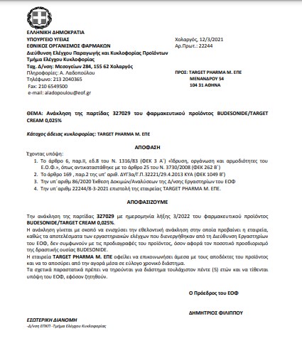 Με ανακοίνωσή του ο Εθνικός Οργανισμός Φαρμάκων (ΕΟΦ) γνωστοποίησε πώς προχωρά στην ανάκληση της παρτίδας 327029 με ημερομηνία λήξης 3/2022 της δερματικής κρέμας BUDESONIDE/TARGET CREAM 0,025%.