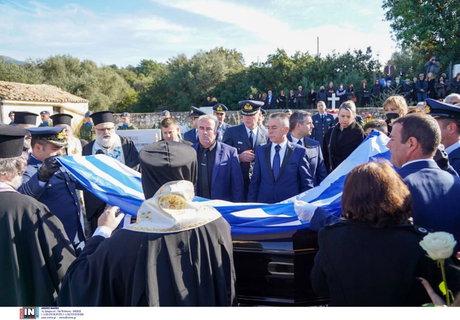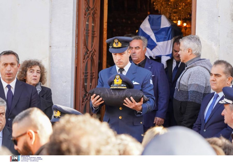 Το φέρετρο του 40χρονου είναι σκεπασμένο με την ελληνική σημαία. Τραγικές φιγούρες η σύζυγος και τα παιδιά του, που έμελλε να δουν και να καταγράψουν σε βίντεο τη συντριβή του εκπαιδευτικού αεροσκάφους.