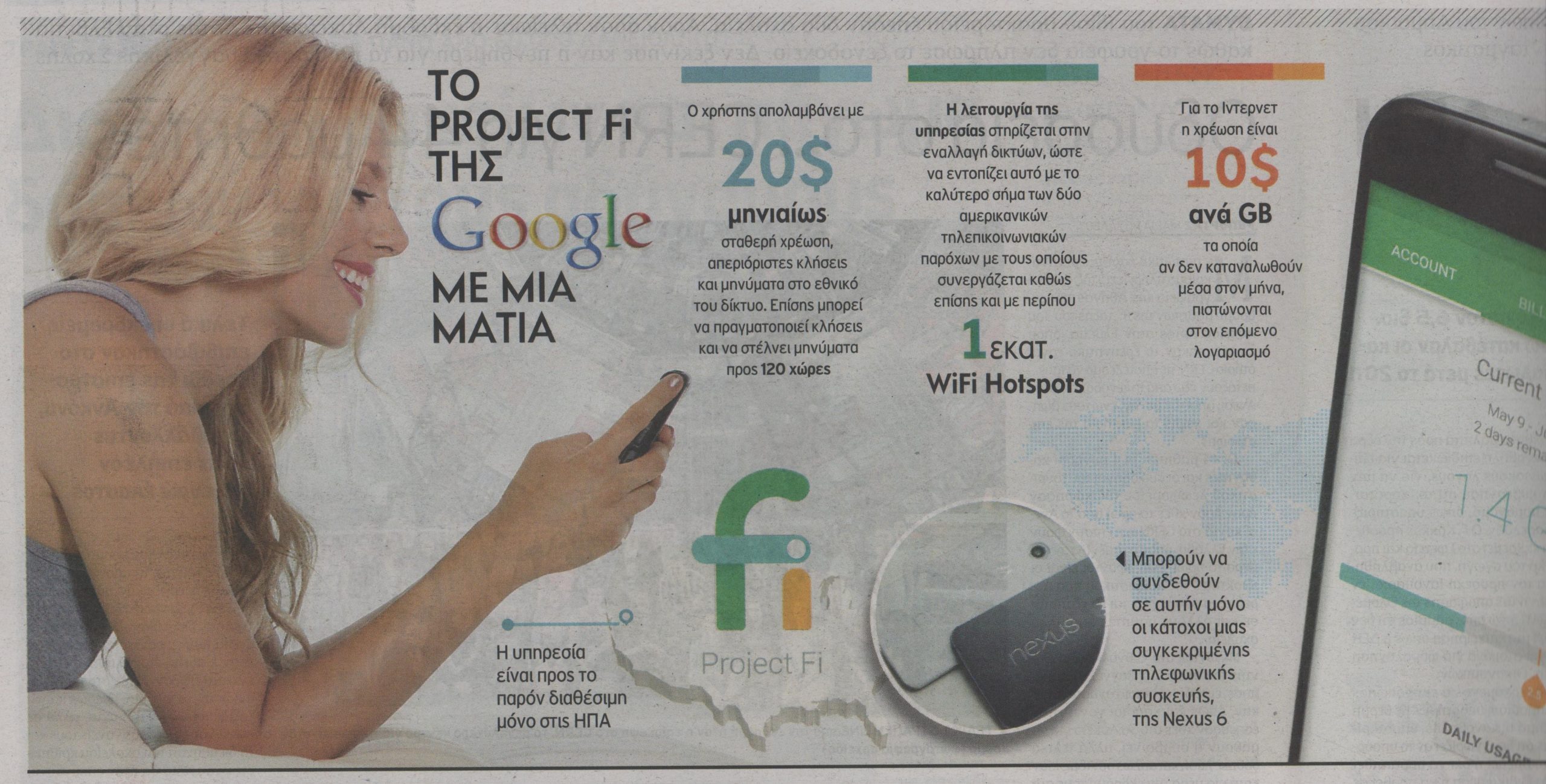 Τα παγκόσμια τηλεπικοινωνιακά νερά ταράζει η Google, η οποία αφότου κατάφερα να αλλάξει τον τρόπο που «σερφάρουν» οι χρήστες στο Διαδίκτυο, κάνει δυναμική είσοδο και στην κινητή τηλεφωνία. Το έργο Project Fi, το οποίο λάνσαρε ήδη στις ΗΠΑ, φιλοδοξεί με μία σταθερή τιμή να αντιμετωπίσει τα… κενά κάλυψης αλλά και τους παραφουσκωμένους λογαριασμούς από δεδομένα που πληρώθηκαν , αλλά δεν καταναλώθηκαν μέσα στον μήνα του λογαριασμού. Η υπηρεσία προέκυψε από τη συνεργασία της Google με δυο τηλεπικοινωνιακούς παρόχους, την T-Mobile USA ΚΑΙ ΤΗ Sprint και υπόσχεται την εναλλαγή δικτύου, ώστε ο συνδρομητής να απολαμβάνει κάθε στιγμή το καλύτερο σήμα.