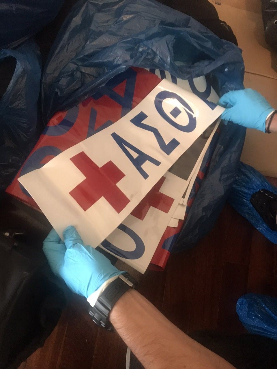 Εκτός από τα όπλα, βρέθηκαν και κατασχέθηκαν: πλήθος αυτοκόλλητων ασθενοφόρων και νοσοκομειακών οχημάτων, φάρος ασθενοφόρου με σύστημα ραδιοσυχνοτήτων, κάμερα, λέιζερ, ηχητικές συσκευές, δύο συχνόμετρα για τον εντοπισμό ψηφιακών και αναλογικών σημάτων (συστήματα εντοπισμού ραδιοσυχνοτήτων), δύο αλεξίσφαιρα γιλέκα, πλήθος πλαστών πινακίδων κυκλοφορίας οχημάτων (4 αυτοκινήτων και 1 μοτοσικλέτας), κινητό, φορητός υπολογιστής, κάμερες καταγραφής κλειστού κυκλώματος τηλεόρασης (CCTV), εκτυπωτής και πλαστικοποιητής, κράνος μοτοσικλέτας, πλήθος εργαλείων, συσκευή ηλεκτρικής κένωσης (TAZER), μεταλλική σιδερογροθιά, πιεστικό μηχάνημα πλύσης –απολύμανσης χώρου, μπουκάλι χλωρίνης, ποσότητες ναρκωτικών ουσιών, ακατέργαστης ινδικής κάνναβης και κοκαΐνης.
