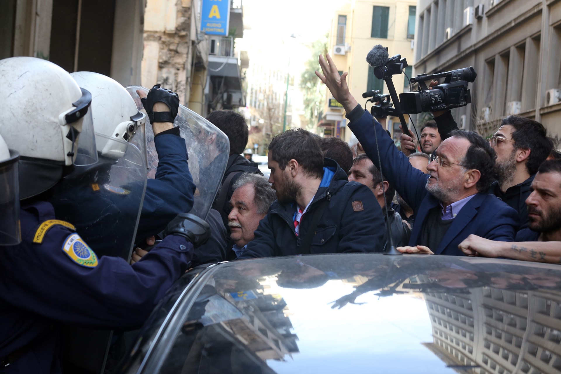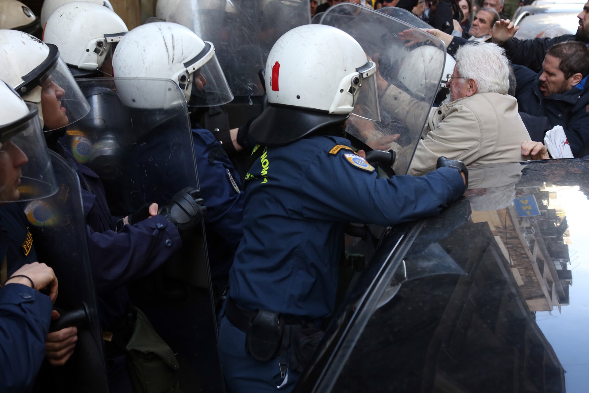 Λίγη ώρα αργότερα όμως τα επεισόδια γενικεύθηκαν καθώς όπως καταγγέλλει στο enikos.gr ο Ηλίας Παπαδόπουλος, μέλος του “Κινήματος κατά των πλειστηριασμών” οι αστυνομικές δυνάμεις απωθούσαν με τις ασπίδες τους όσους προσπαθούσαν να προσεγγίσουν το κτίριο. Η κατάσταση βγήκε εκτός ελέγχου όταν όπως καταγγέλλουν οι διαδηλωτές οι άνδρες των ΜΑΤ άρχισαν να χτυπάνε αδιακρίτως και μάλιστα έκαναν χρήση χημικών.