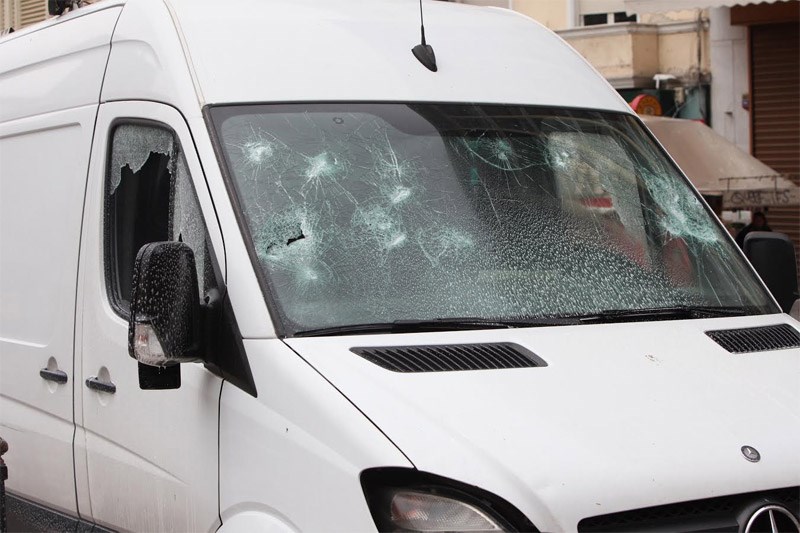 Παράλληλα, άλλα άτομα πέταξαν πέτρες σε βαν τηλεοπτικού σταθμού στην πλατεία Κλαυθμώνος, ενώ επεισόδια έγιναν και στην Ομόνοια.