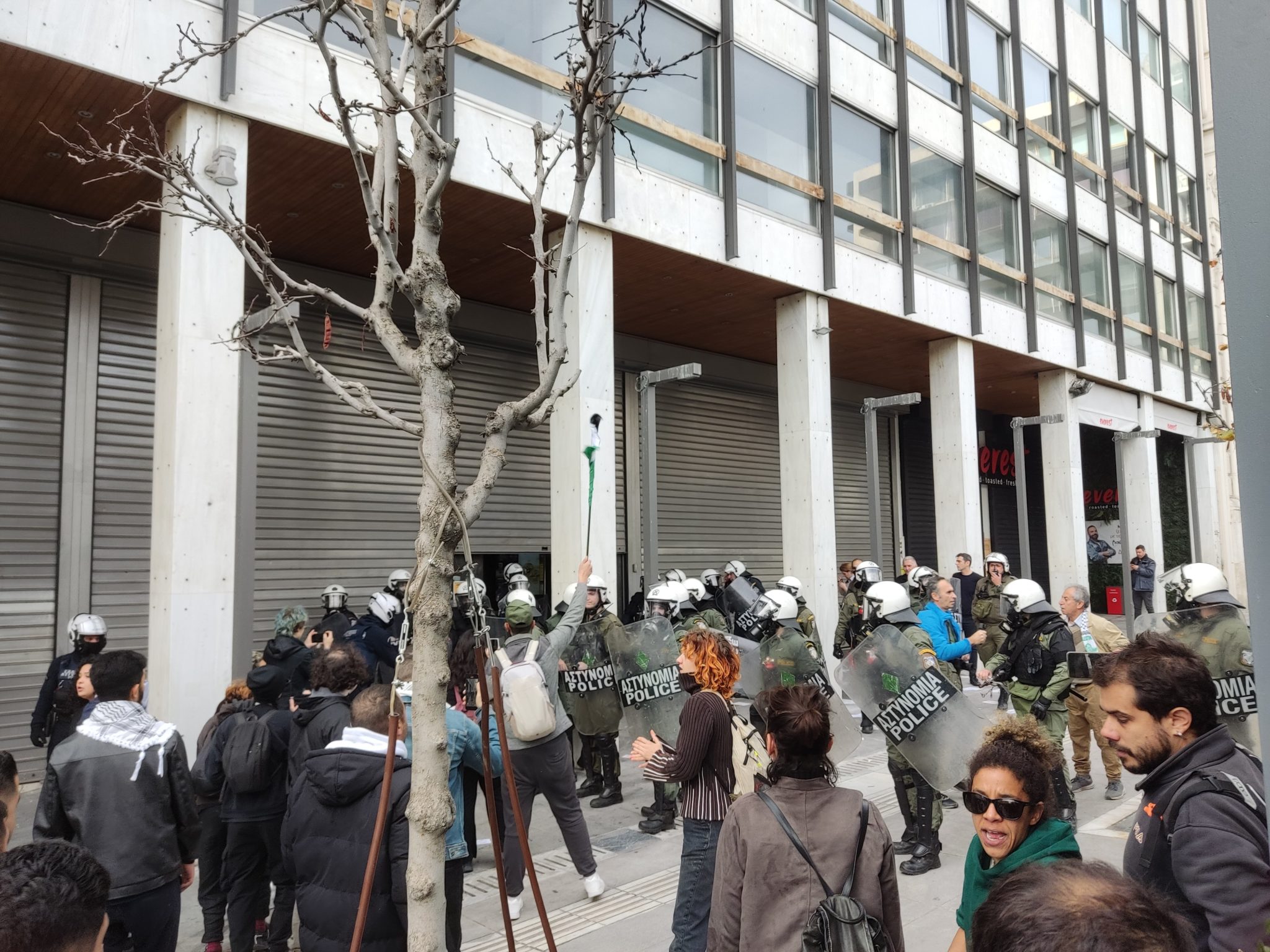 Επεισόδια σημειώθηκαν το μεσημέρι του Σαββάτου στην Ερμού, στο κέντρο της Αθήνας στη διάρκεια συγκέντρωσης για την Παλαιστίνη.