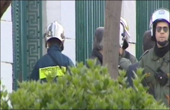 Ενα νέο κλιμάκιο της πυροσβεστικής με μια σκάλα, μπήκε και αυτό στον προαύλιο χώρο του ΕΚΠΑ, καθώς όπως φαίνεται, η προσπάθεια των αρχών για να εισέλθουν στο κτίριο της πρυτανείας, έγινε πλέον από κάποιο παράθυρο.