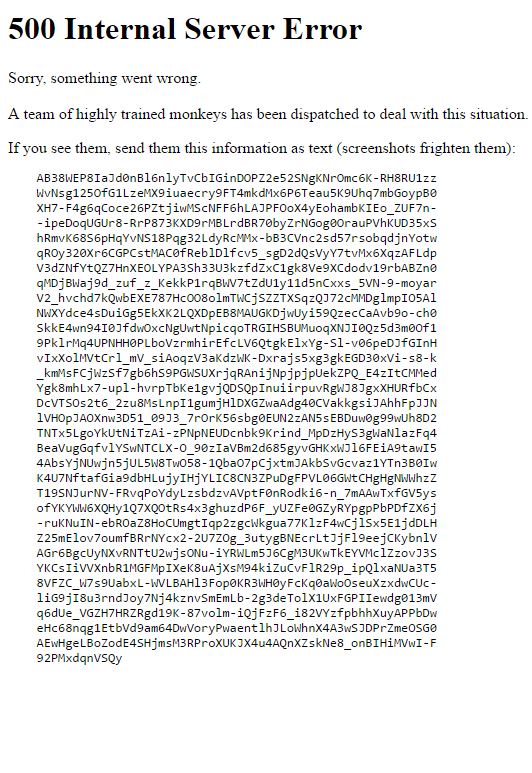 «Συγγνώμη, κάτι πήγε στραβά. Μία ομάδα από εξαιρετικά εκπαιδευμένες μαϊμούδες έχει ενεργοποιηθεί προκειμένου να αντιμετωπίσει αυτή την κατάσταση. Αν τις δείτε, να τις στείλετε αυτές τις πληροφορίες ως κείμενο. (Τα screenshot τις τρομάζουν).