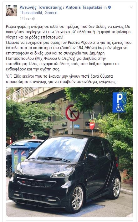 Μεταξύ άλλων, ο Παραολυμπιονίκης είχε γράψει: “Να μην τους τύχει ποτέ…να τους τύχει μόνο να βάλουν λίγο μυαλό και να τις φέρουν πίσω”. Όπως φαίνεται οι δράστες… άκουσαν τον Αντώνη Τσαπατάκη και όπως γνωστοποίησε ο ίδιος μέσω Facebook, επέστρεψαν τις ρόδες του αυτοκινήτου τις οποίες είχαν κλέψει.