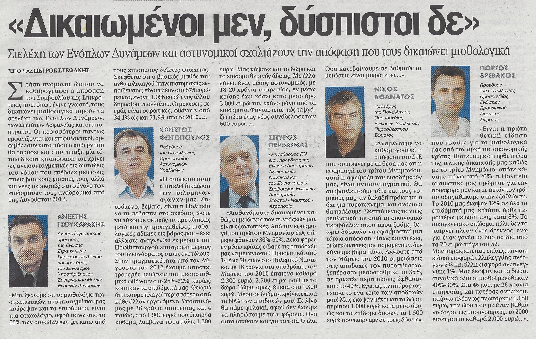 Στάση αναμονής ώσπου να καθαρογραφεί η απόφαση του Συμβουλίου της Επικρατείας που, όπως έγινε γνωστό, τους δικαιώνει μισθολογικά τηρούν τα στελέχη των Ενόπλων Δυνάμεων, των Σωμάτων Ασφαλείας και οι απόστρατοι.