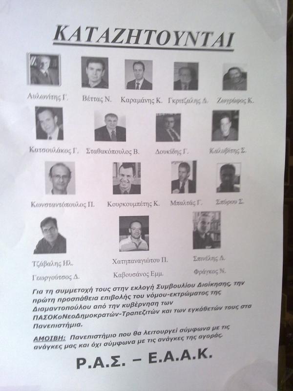 Αφίσα με τίτλο “Καταζητούνται” έβγαλε η κίνηση Ριζοσπαστική Αριστερή Φωνή ΕΑΑΚ, με αφορμή την παραγγελία του εισαγγελέα Πρωτοδικών Θεσσαλονίκης που διεξάγει κατεπείγουσα προκαταρκτική εξέταση να ζητήσει από την Γραμματεία της Πρυτανείας του ΑΠΘ στοιχεία του Πρύτανη, των μελών του ΔΣ του ΕΣΔΕΠ ΑΠΘ, του Προέδρου των Διοικητικών ΑΠΘ και φοιτητών απο ΜΑΣ, ΕΑΑΚ και ΑΡΕΝ που παρενέβησαν στην συνεδρίαση της οργανωτικής επιτροπής στο πλαίσιο της εκλογής διοίκησης στο πανεπιστήμιο στις 8 Φεβρουαρίου.