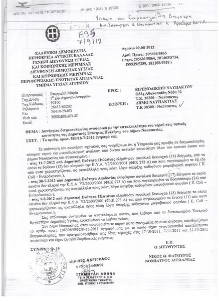 Οι κάτοικοι και οι επισκέπτες των χωριών της Ορεινής Ναυπακτίας έπιναν ακατάλληλο νερό, αφούσύμφωνα με τα αποτελέσματα των ελέγχων από τη Διεύθυνση Υγιεινής η οποία προχώρησε σε δειγματοληψία για την καταλληλότητα των νερών στις τοπικές κοινότητες Πυλλήνης, Αποδοτίας, Πλατάνου χαρακτηρίστηκαν ακατάλληλα τα νερά προς πόση, λόγω ύπαρξης παθογόνου μικροβιακού φορτίου και συγκεκριμένα E. Colli- Εντερόκοκκου. Οι έλεγχοι διενεργήθηκαν τον Ιούλιο και τον Αύγουστο σε μια περίοδο που η Ορεινή Ναυπακτία σφύζει από τουρισμό.