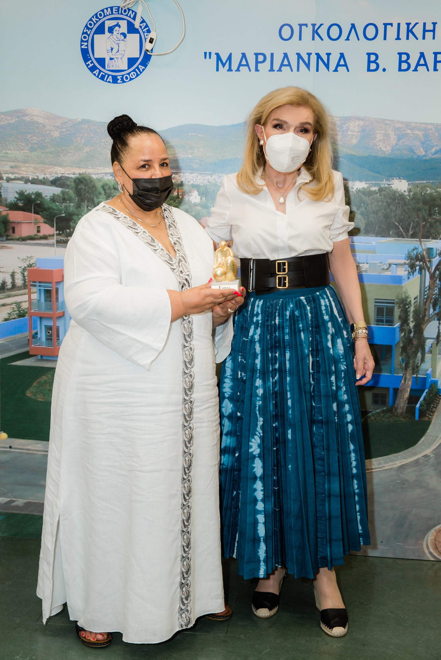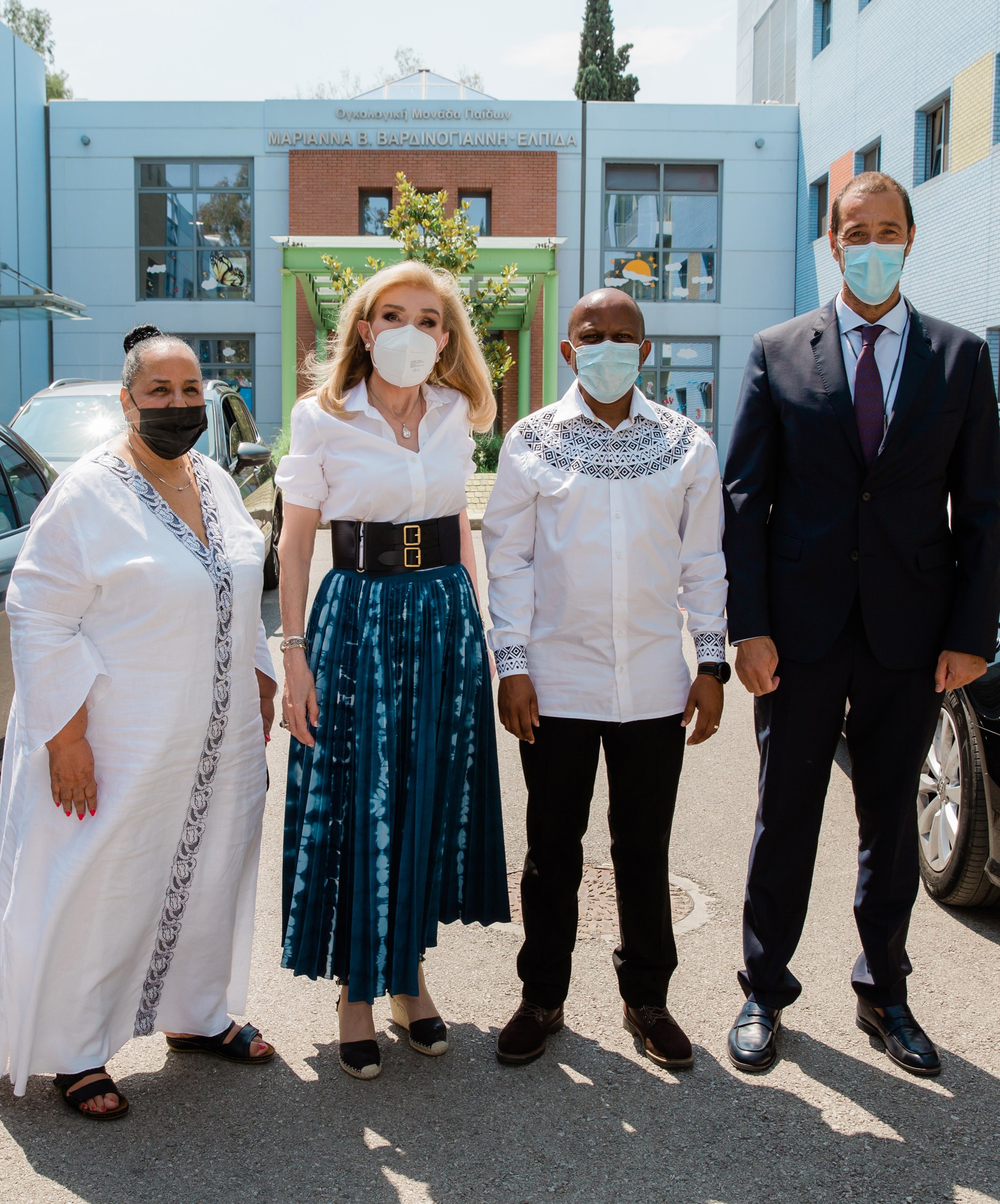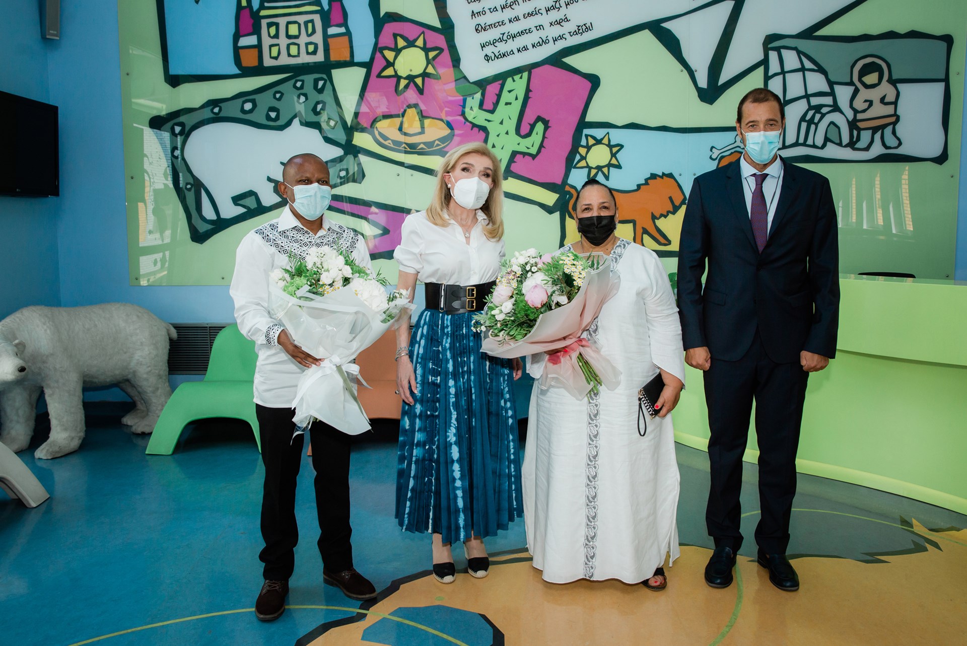 Τον κύριο Hatang και την κυρία Sisulu υποδέχτηκαν η Πρόεδρος του Σωματείου «ΕΛΠΙΔΑ-Σύλλογος Φίλων Παιδιών με καρκίνο» κυρία Μαριάννα Β. Βαρδινογιάννη και ο κοινός Διοικητής των Νοσοκομείων Παίδων «ΑΓΙΑ ΣΟΦΙΑ» και «Π.&Α. Κυριακού» κύριος Μανώλης Παπασάββας.