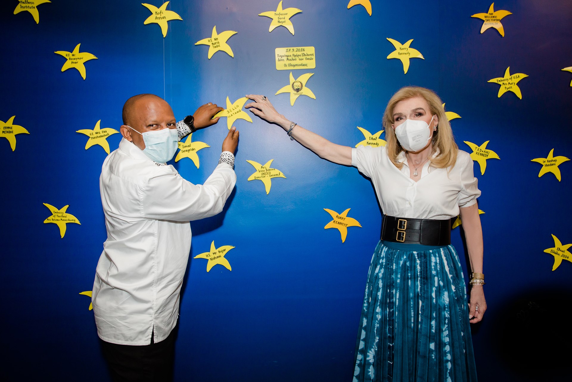 Η κυρία Βαρδινογιάννη απένειμε στον κύριο Hatang και την κυρία Sisulu τιμητικές διακρίσεις της «ΕΛΠΙΔΑΣ», σε αναγνώριση του σπουδαίου τους έργου, ενώ τοποθέτησαν συμβολικά όλοι μαζί στον «Τοίχο των Αστεριών της ΕΛΠΙΔΑΣ» το αστέρι του «Iδρύματος Nelson Mandela».