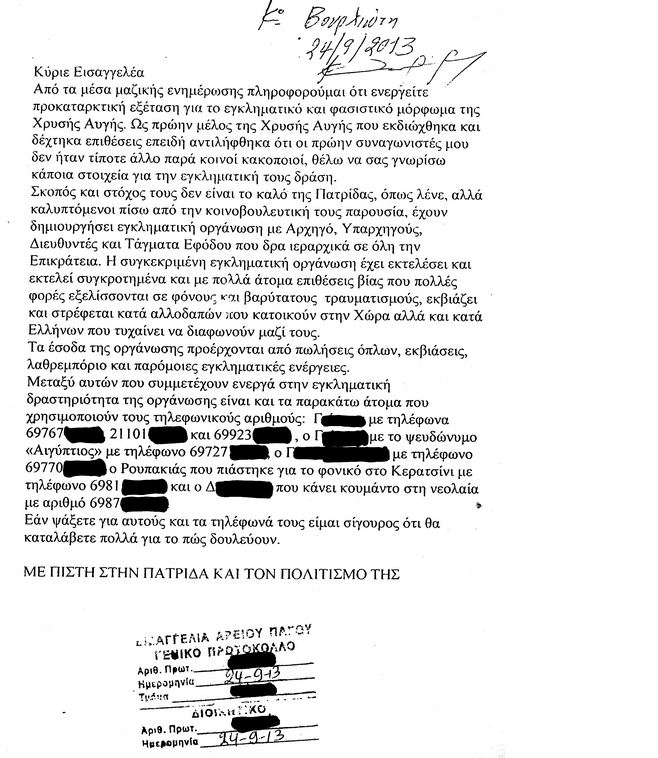 Ανώνυμη επιστολή στον αντεισαγγελέα του Αρείου Πάγου στάλθηκε στις 24 Σεπτεμβρίου, από πρώην μέλος της Χρυσής Αυγής και περιγράφει την εγκληματική δραστηριότητα της οργάνωσης.