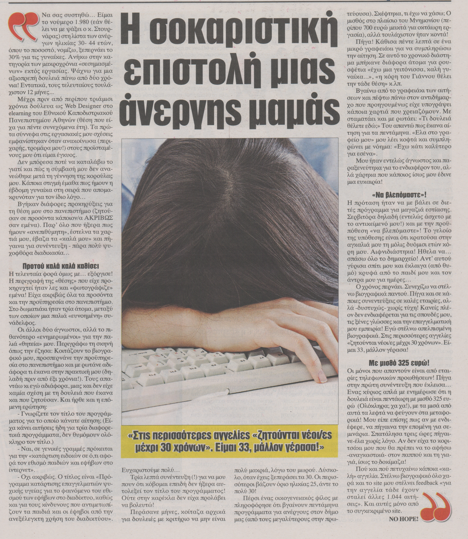«Να σας συστηθώ… Είμαι το νούμερο 1.980 (εάν θέλει να με ψάξει ο κ.Στουρνάρας) στη λίστα των ανέργων ηλικίας 30-44 ετών, όπου το ποσοστό, νομίζω, ξεπερνάει το 30% για τις γυναίκες. Ανήκω στην κατηγορία των μακροχρόνια «σεσημασμένων» εκτός εργασίας. Ψάχνω για μια αξιοπρεπή δουλειά πάνω από δύο χρόνια! Εντατικά, τους τελευταίους τουλάχιστον 12 μήνες…