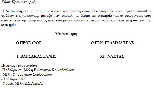 Επιστολή της ΕΣΑμεΑ στον Πρωθυπουργό