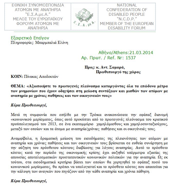 Την αξιοποίηση του πρωτογενούς πλεονάσματος, ώστε να καταργηθούν όλα τα επώδυνα μέτρα των μνημονίων, που έχουν οδηγήσει στη μείωση συντάξεων και μισθών των ατόμων με αναπηρία με χρόνιες παθήσεις και των οικογενειών τους, ζητά με επιστολή της στον Πρωθυπουργό της χώρας, Αντώνη Σαμαρά, η Εθνική Συνομοσπονδία Ατόμων με Αναπηρία.