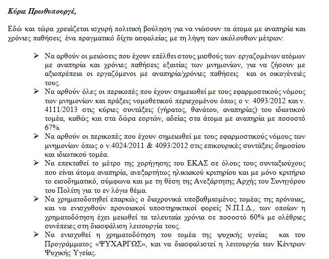 – Να αρθούν οι μειώσεις που έχουν επέλθει στους μισθούς των εργαζομένων ατόμων με αναπηρία και χρόνιες παθήσεις, εξαιτίας των μνημονίων, για να ζήσουν με αξιοπρέπεια οι εργαζόμενοι με αναπηρία/χρόνιες παθήσεις και οι οικογένειές τους.