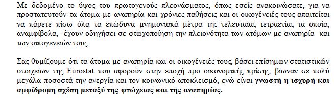 Ως εκ τούτου, στα εισοδηματικά κριτήρια, βάσει των οποίων θα χορηγηθεί το εφάπαξ ποσό του κοινωνικού μερίσματος, θα πρέπει να υπολογιστεί και το πρόσθετο κόστος, που απαιτείται για την κάλυψη των αναγκών, που πηγάζουν από την κάθε αναπηρία και χρόνια πάθηση. Για να προστατευτούν ουσιαστικά τα άτομα με αναπηρία και χρόνιες παθήσεις και οι οικογένειές τους, απαιτείται να καταργηθούν όλα τα επώδυνα μνημονιακά μέτρα της τελευταίας τετραετίας, τα οποία, αναμφίβολα, έχουν οδηγήσει σε φτωχοποίηση την πλειονότητα των ατόμων με αναπηρία και των οικογενειών τους και να ληφθούν ουσιαστικά μέτρα: