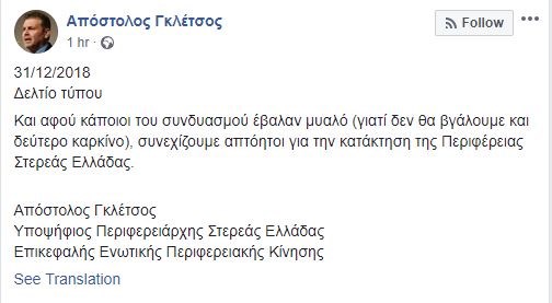 Επέστρεψε στην κούρσα για την κατάκτηση της Περιφέρειας Στερεάς Ελλάδας ο Απόστολος Γκλέτσος καθώς κάποιοι του συνδυασμού του, όπως αναφέρει σε ανάρτησή του στο facebook, έβαλαν μυαλό.