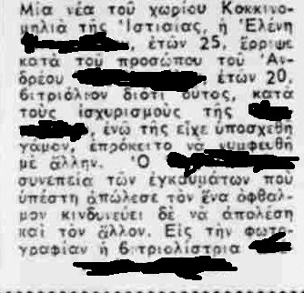 Στις 24 Ιουλίου 1956 στην “Απογευματινή” γίνεται λόγος για μια επίθεση με βιτριόλι στην Κοκκινομηλιά Ιστιαίας.