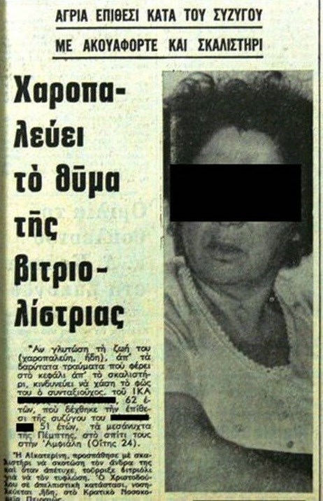 “Η βιτριολίστρια του Πειραιά”Τον Ιούλιο του 1978, στο πρωτοσέλιδο της εφημερίδα “Ακρόπολις” φιλοξενείται δημοσίευμα με τίτλο «Χαροπαλεύει το θύμα της βιτριολίστριας» και την λεζάντα «Άγρια επίθεση κατά του συζύγου με ακουαφόρτε και σκαλιστήρι».