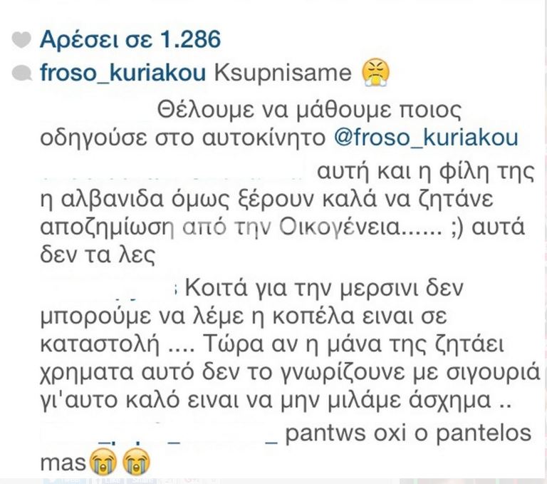 Το νεαρό κορίτσι που βρισκόταν μαζί με την Μυρσίνη και τον Παντελή στο μοιραίο τζιπ αμέσως μετά την έξοδό του από το νοσοκομείο “έκλεισε” τον λογαριασμό του στο facebook, ενώ “κλείδωσε” και το προφίλ της στο instagram. Για το δεύτερο όμως ήταν αργά αφού με το που έγιναν γνωστά τα ονόματα των δύο κοριτσιών χιλιάδες έσπευσαν να τις “ακολουθήσουν”, οπότε και παρά το κλείδωμα είχαν πλέον πρόσβαση στις φωτογραφίες αλλά και το δικαίωμα να σχολιάσουν ότι θέλουν.