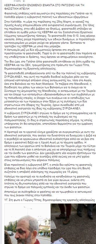 «Καλούμε την αριστερά και τα συνδικάτα να καταδικάσουν τις φασιστικές επιθέσεις και να μπούν μπροστά σε ένα γύρο αγώνων, ενάντια στη λιτότητα,τις ιδιωτικοποιήσεις αλλά και την εθνικιστική εκστρατεία που στρώνει το δρόμο για πολεμικές εμπλοκές και την άνοδο των φασιστών», καταλήγει η σχετική καταγγελία.