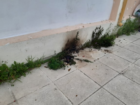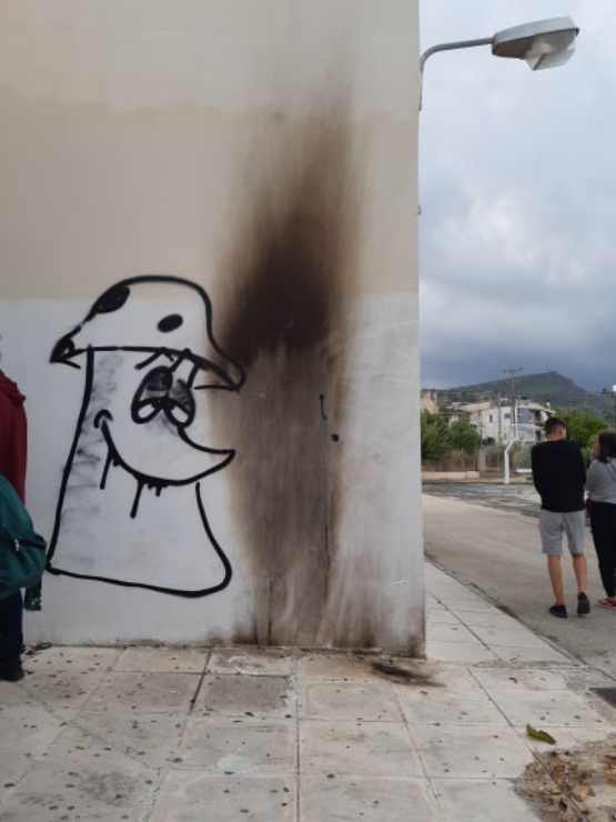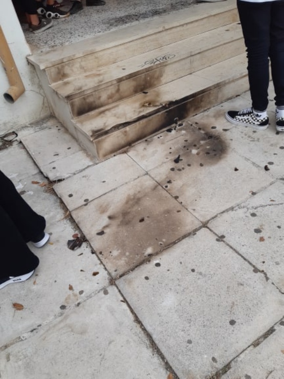 Σε μια από τις εισόδους και σε τοίχους σε διάφορα σημεία του σχολείου ήταν εμφανή τα σημάδια από την φωτιά που προκάλεσαν τουλάχιστον τρεις βόμβες μολότοφ που εκτοξεύθηκαν από αγνώστους, κάποια στιγμή από το απόγευμα της Τετάρτης μέχρι το ξημέρωμα της Πέμπτης.