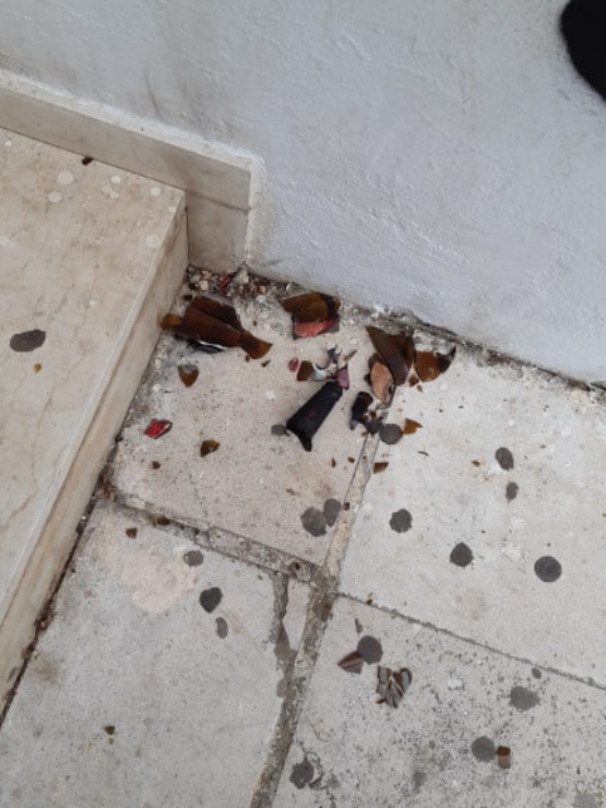 Στο προαύλιο, όπως φαίνεται και στις φωτογραφίες που έστειλε στον Ant1news.gr ένας από τους μαθητές του Γενικού Λυκείου Ξυλοκάστρου, βρέθηκαν και τα θραύσματα από τα γυάλινα μπουκάλια των μολότοφ.