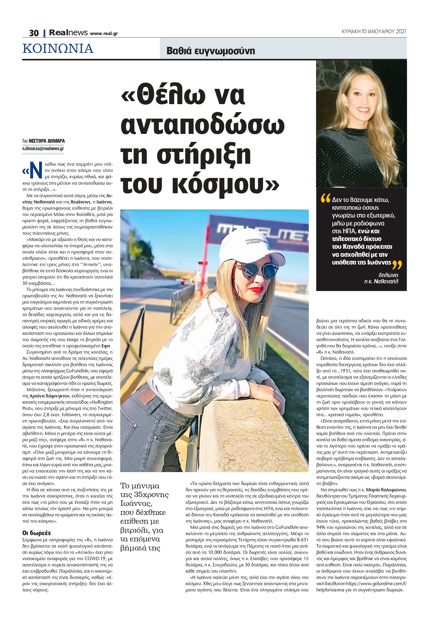 «Μακάρι να με αξιώσει ο Θεός και να καταφέρω να υλοποιήσω τα όνειρά μου, μέσα στα οποία πλέον είναι και η προσφορά στον συνάνθρωπο», προσθέτει η Ιωάννα, που νοσηλεύτηκε επί τρεις μήνες στο ‘‘Αττικόν’’, υποβλήθηκε σε επτά δύσκολα χειρουργεία, ενώ οι γιατροί εκτιμούν ότι θα χρειαστούν συνολικά 30 επεμβάσεις… Το μήνυμα της Ιωάννας συνδυάστηκε με την πρωτοβουλία της Αν. Ναθαναήλ να ξεκινήσει μια παγκόσμια καμπάνια για τη συγκέντρωση χρημάτων που απαιτούνται για τη νοσηλεία, τα δεκάδες χειρουργεία, αλλά και για τις δαπανηρές ιατρικές αγωγές με ειδικές κρέμες και αλοιφές που ακολουθεί η Ιωάννα για την αποκατάσταση του προσώπου και άλλων σημείων του σώματός της που έκαψε το βιτριόλι με το οποίο της επιτέθηκε η προφυλακισμένη Εφη. Συγκινημένη από το δράμα της κοπέλας, η Αν. Ναθαναήλ απηύθυνε τις τελευταίες ημέρες δραματική έκκληση για βοήθεια της Ιωάννας μέσω της πλατφόρμας GoFundMe, που αφορά άτομα τα οποία χρήζουν βοήθειας, με αποτέλεσμα να καταγράφονται ήδη οι πρώτες δωρεές. Μάλιστα, ξεχωριστή ήταν η ανταπόκριση της Aριάνα Χάφινγκτον, εκδότριας της αμερικανικής ενημερωτικής ιστοσελίδας «Huffington Post», που στήριξε με μήνυμά της στο Twitter, όπου έχει 2,8 εκατ. followers, τη συγκεκριμένη πρωτοβουλία. «Εχω συγκλονιστεί από τον αγώνα της Ιωάννας. Και έχω πεισμώσει. Είναι αβοήθητη. Μόνο η μητέρα της είναι νύχτα-μέρα μαζί της», ανέφερε στην «R» η κ. Ναθαναήλ, που έγραψε στον προσωπικό της λογαριασμό: «Ολοι μαζί μπορούμε να κάνουμε τη διαφορά στη ζωή της. Μια μικρή συνεισφορά, έστω και λίγων ευρώ από τον καθένα μας, μπορεί να επισπεύσει την ίασή της και να την κάνει να νιώσει την αγάπη και τη στήριξη που τόσο έχει ανάγκη». Η ίδια σε κάποια από τις συζητήσεις της με την Ιωάννα σοκαρίστηκε, όταν η κοπέλα τής είπε πως «το μόνο που με ένοιαζε ήταν να μη χάσω τελείως την όρασή μου. Να μην μπορώ να απολαμβάνω τα χρώματα και τις εικόνες αυτού του κόσμου».