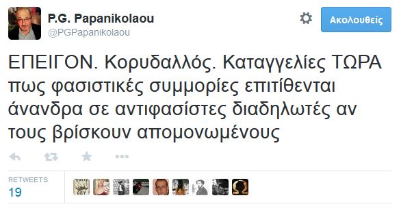 «ΕΠΕΙΓΟΝ. Κορυδαλλός. Καταγγελίες ΤΩΡΑ πως φασιστικές συμμορίες επιτίθενται άνανδρα σε αντιφασίστες διαδηλωτές αν τους βρίσκουν απομονωμένους», γράφει στο tweet.