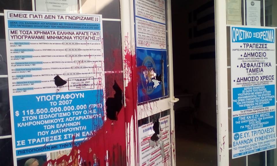 “Ο πολιτικός φορέας Ελλήνων Συνέλευσις Τρίπολης “ενημερώνει τους Αρκάδες πολίτες και όλους τους Συνέλληνες φίλους της Ελλήνων Συνέλευσις Τρίπολης για την τρομοκρατική ενέργεια που δέχθηκαν τα γραφεία μας την Τρίτη, στις 4 το πρωί. Άγνωστοι έσπασαν τα γραφεία μας και προκάλεσαν ζημιές 500 € , σπάζοντας τις τζαμαρίες και βάφοντας με κόκκινες μπογιές το εξωτερικό και το εσωτερικό των γραφείων μας.