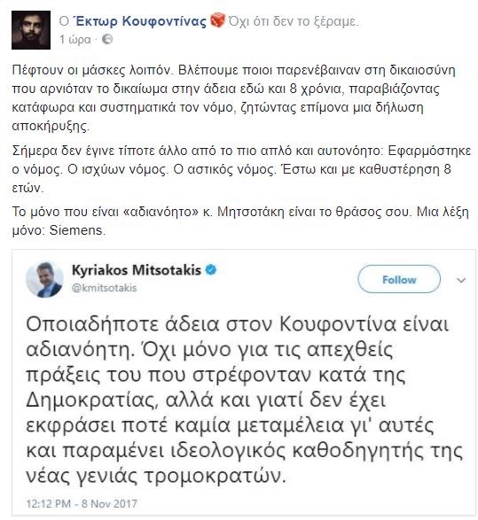 Ο Έκτορας Κουφοντίνας έγραψε στο Facebook: «Πέφτουν οι μάσκες λοιπόν. Βλέπουμε ποιοι παρενέβαιναν στη δικαιοσύνη που αρνιόταν το δικαίωμα στην άδεια εδώ και 8 χρόνια, παραβιάζοντας κατάφωρα και συστηματικά τον νόμο, ζητώντας επίμονα μια δήλωση αποκήρυξης. Σήμερα δεν έγινε τίποτε άλλο από το πιο απλό και αυτονόητο: Εφαρμόστηκε ο νόμος. Ο ισχύον νόμος. Ο αστικός νόμος. Έστω και με καθυστέρηση 8 ετών. Το μόνο που είναι «αδιανόητο» κ. Μητσοτάκη είναι το θράσος σου. Μια λέξη μόνο: Siemens».