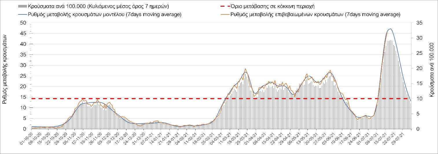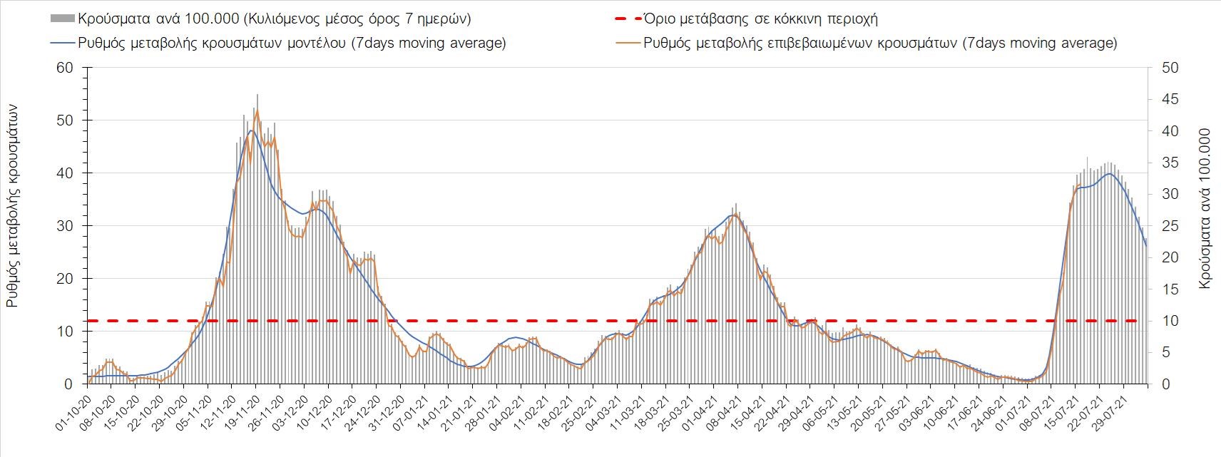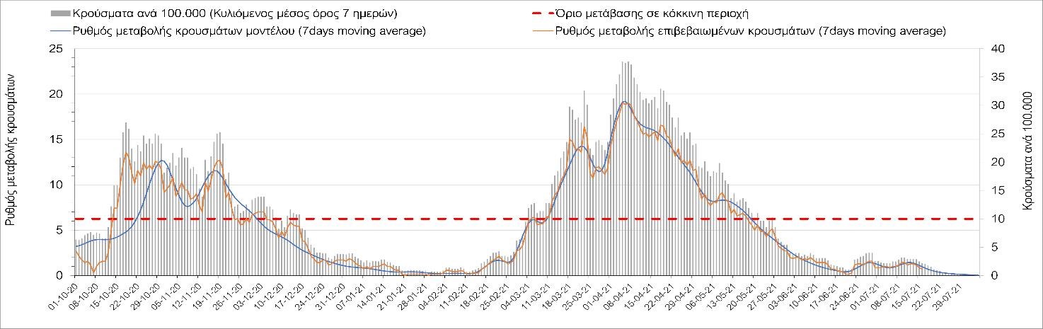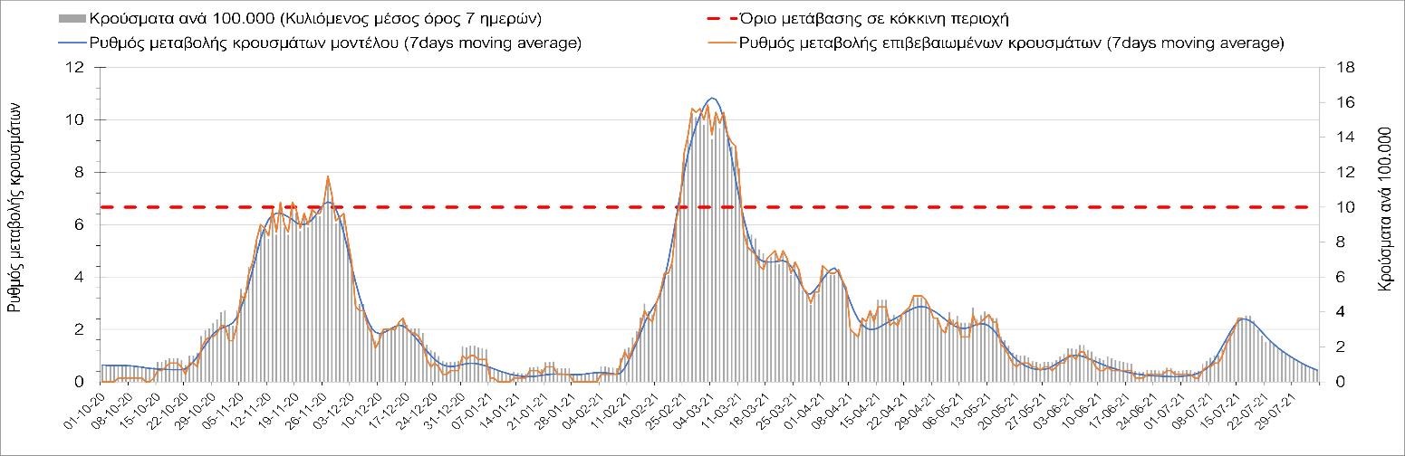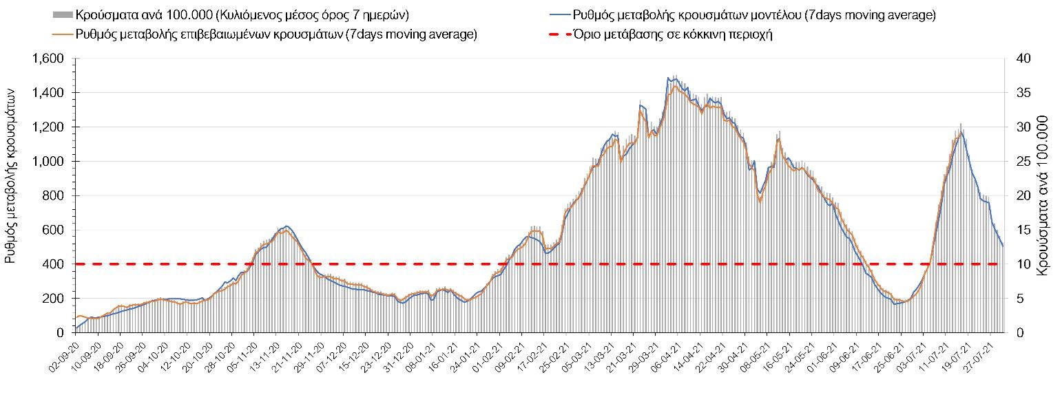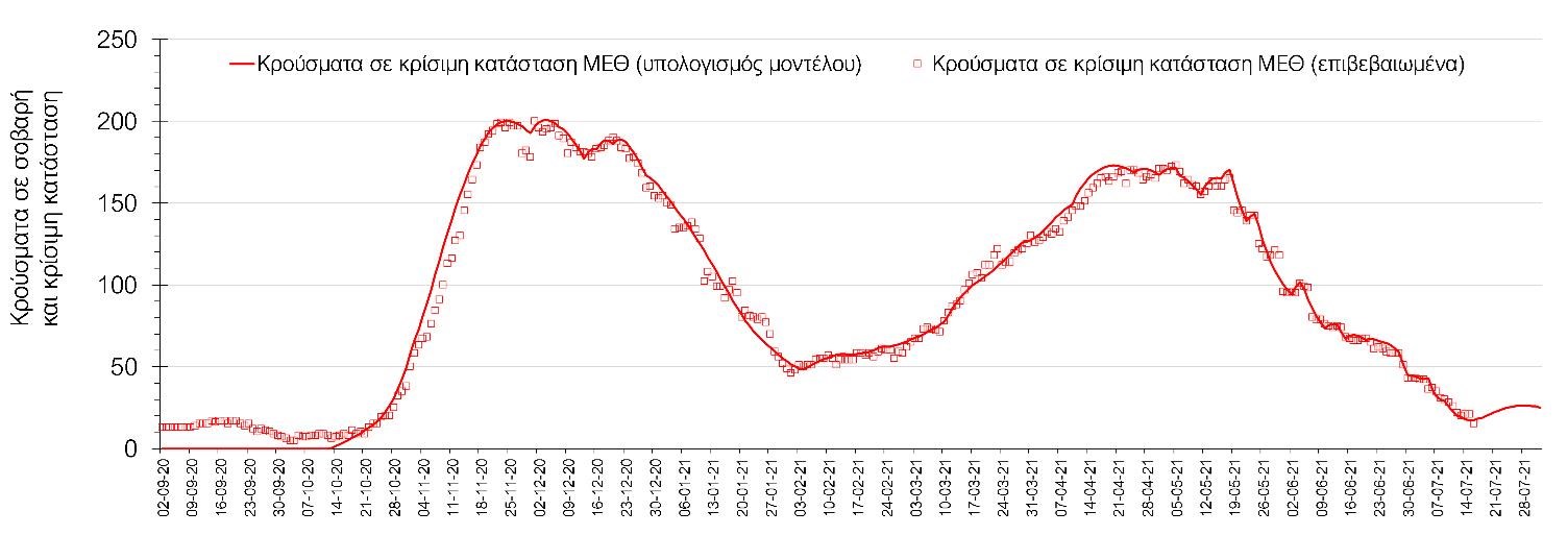 Η πορεία της μέσης εβδομαδιαίας τιμής των κρουσμάτων, καθώς και του κυλιόμενου μέσου όρου 7 ημερών του αριθμού των κρουσμάτων ανά 100.000 πληθυσμού, όπως έχουν καταγραφεί από τον ΕΟΔΥ και η αναμενόμενη πορεία τους όπως προδιαγράφεται από την υπολογιστική πλατφόρμα CORE για την Ελληνική επικράτεια μέχρι τις 31 Ιουλίου, αποτυπώνονται στο Σχήμα 4. Αυτή η προβλεπόμενη πορεία, που αφορά τα κρούσματα, τους νοσηλευόμενους σε απλές κλίνες, όσο και σε ΜΕΘ, καθώς επίσης και τους θανάτους, βασίζεται στις ακόλουθες παραδοχές: