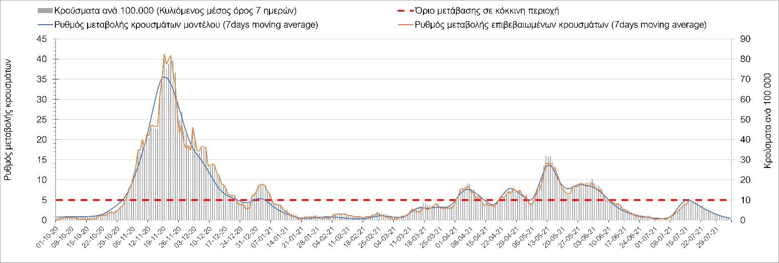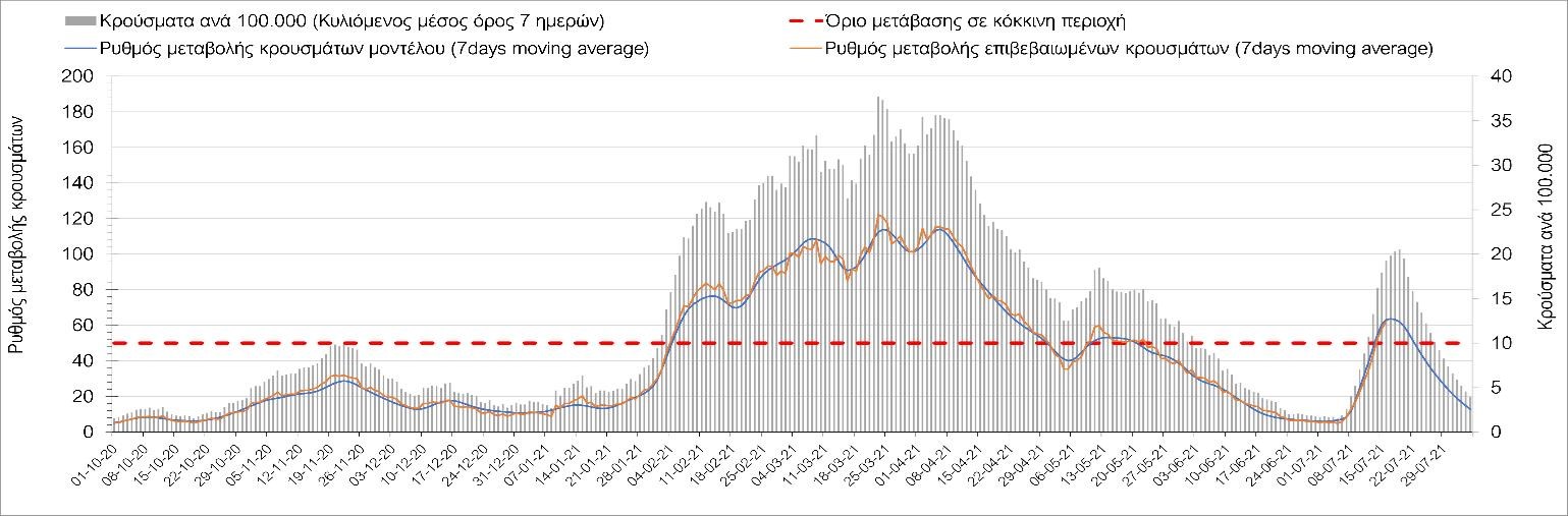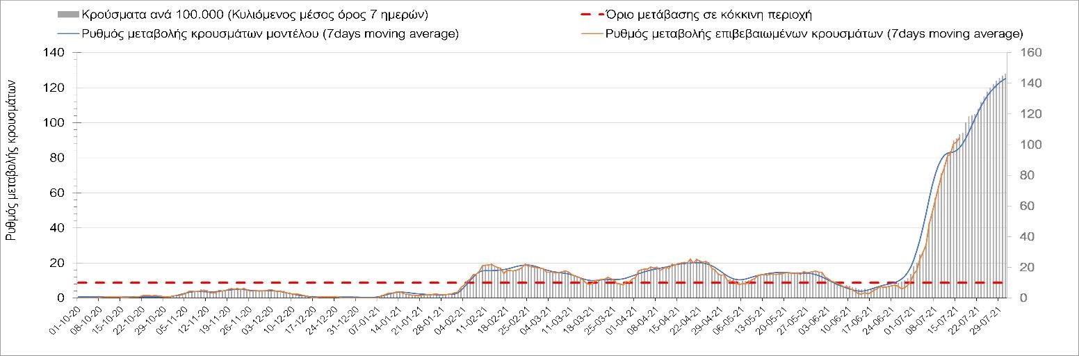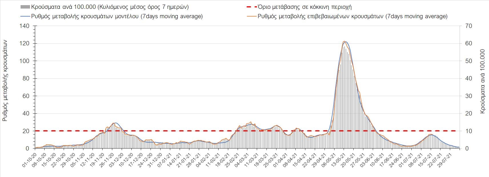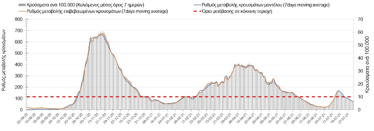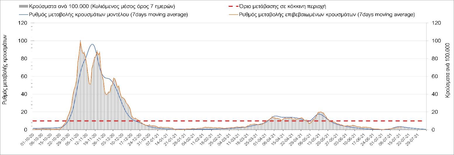 Η πορεία της μέσης εβδομαδιαίας τιμής των κρουσμάτων, καθώς και του κυλιόμενου μέσου όρου 7 ημερών του αριθμού των κρουσμάτων ανά 100.000 πληθυσμού, όπως έχουν καταγραφεί από τον ΕΟΔΥ και η αναμενόμενη πορεία τους όπως προδιαγράφεται από την υπολογιστική πλατφόρμα CORE για την Ελληνική επικράτεια μέχρι τις 31 Ιουλίου, αποτυπώνονται στο Σχήμα 4. Αυτή η προβλεπόμενη πορεία, που αφορά τα κρούσματα, τους νοσηλευόμενους σε απλές κλίνες, όσο και σε ΜΕΘ, καθώς επίσης και τους θανάτους, βασίζεται στις ακόλουθες παραδοχές: