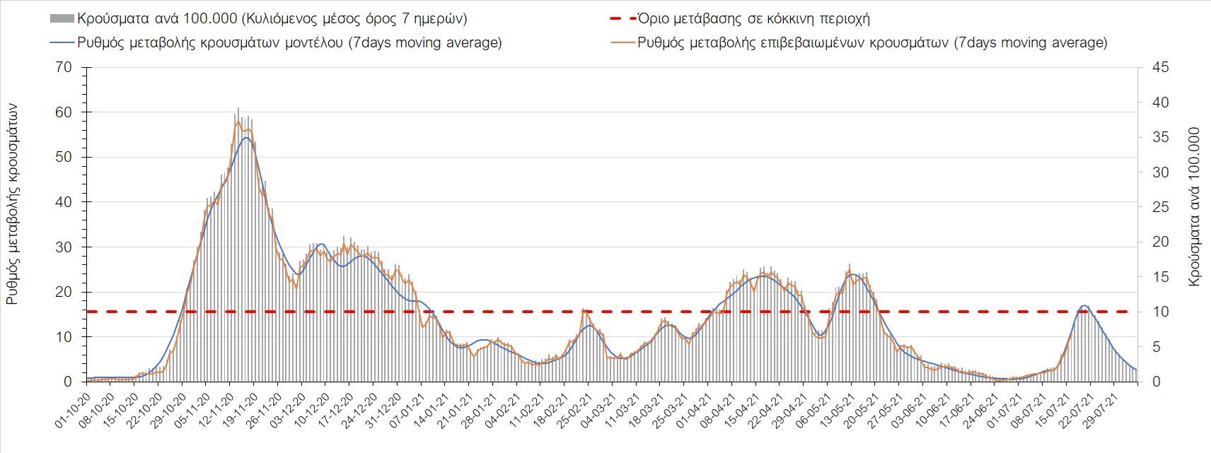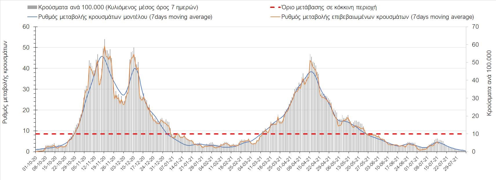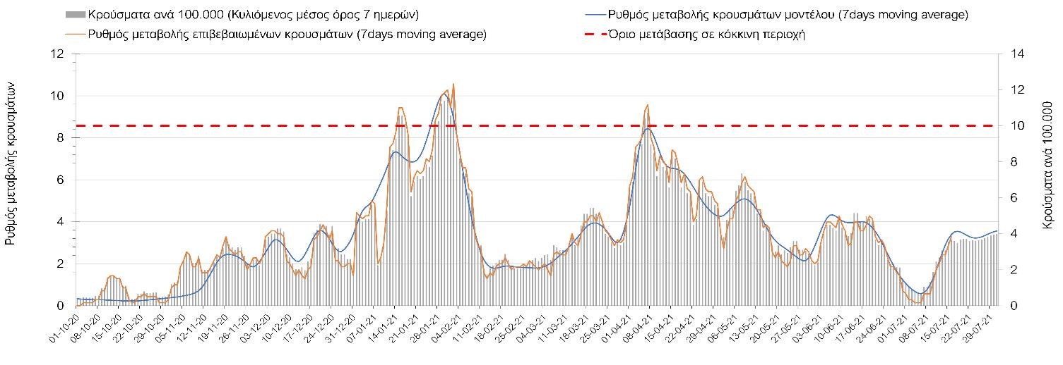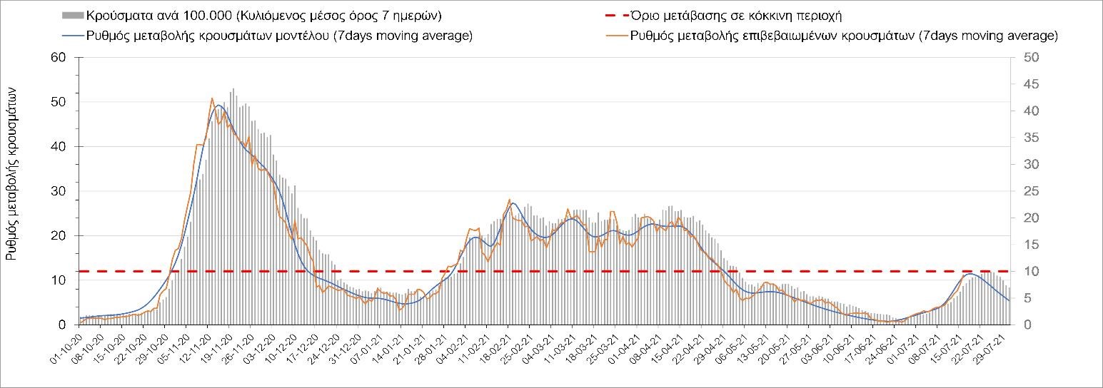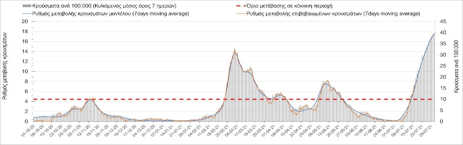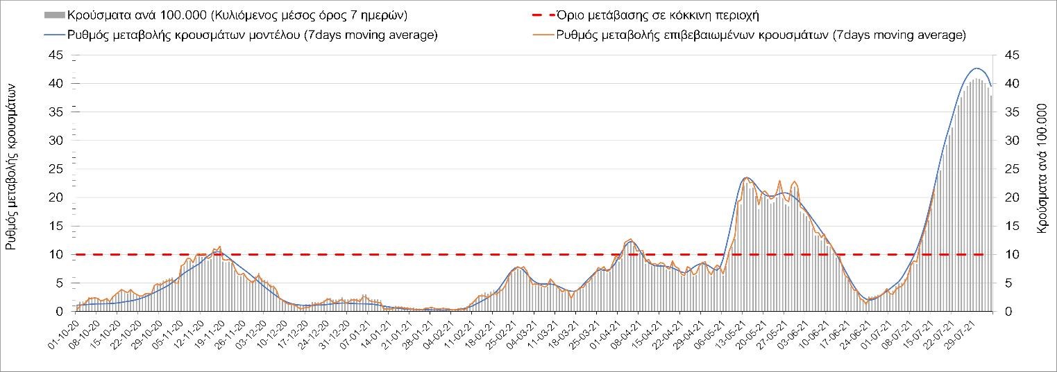 Η πορεία της μέσης εβδομαδιαίας τιμής των κρουσμάτων, καθώς και του κυλιόμενου μέσου όρου 7 ημερών του αριθμού των κρουσμάτων ανά 100.000 πληθυσμού, όπως έχουν καταγραφεί από τον ΕΟΔΥ και η αναμενόμενη πορεία τους όπως προδιαγράφεται από την υπολογιστική πλατφόρμα CORE για την Ελληνική επικράτεια μέχρι τις 31 Ιουλίου, αποτυπώνονται στο Σχήμα 4. Αυτή η προβλεπόμενη πορεία, που αφορά τα κρούσματα, τους νοσηλευόμενους σε απλές κλίνες, όσο και σε ΜΕΘ, καθώς επίσης και τους θανάτους, βασίζεται στις ακόλουθες παραδοχές: