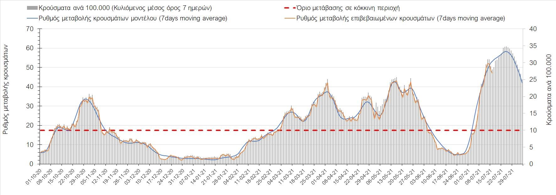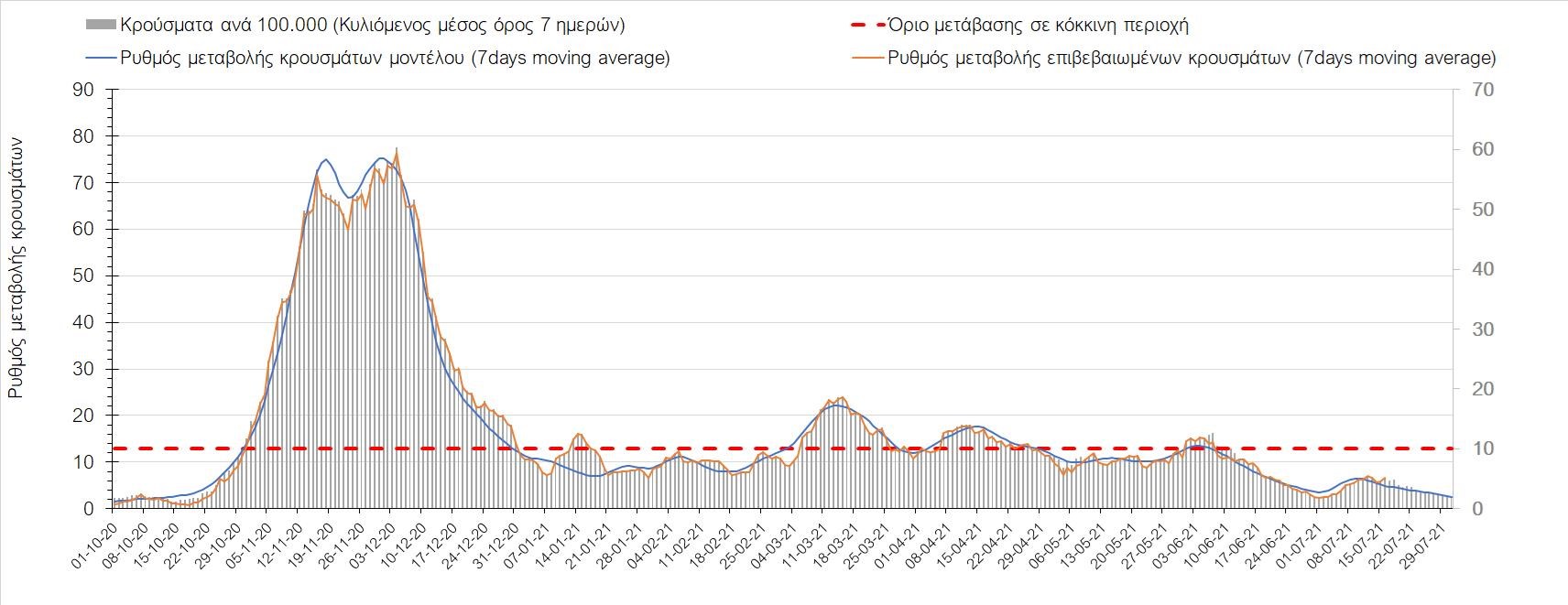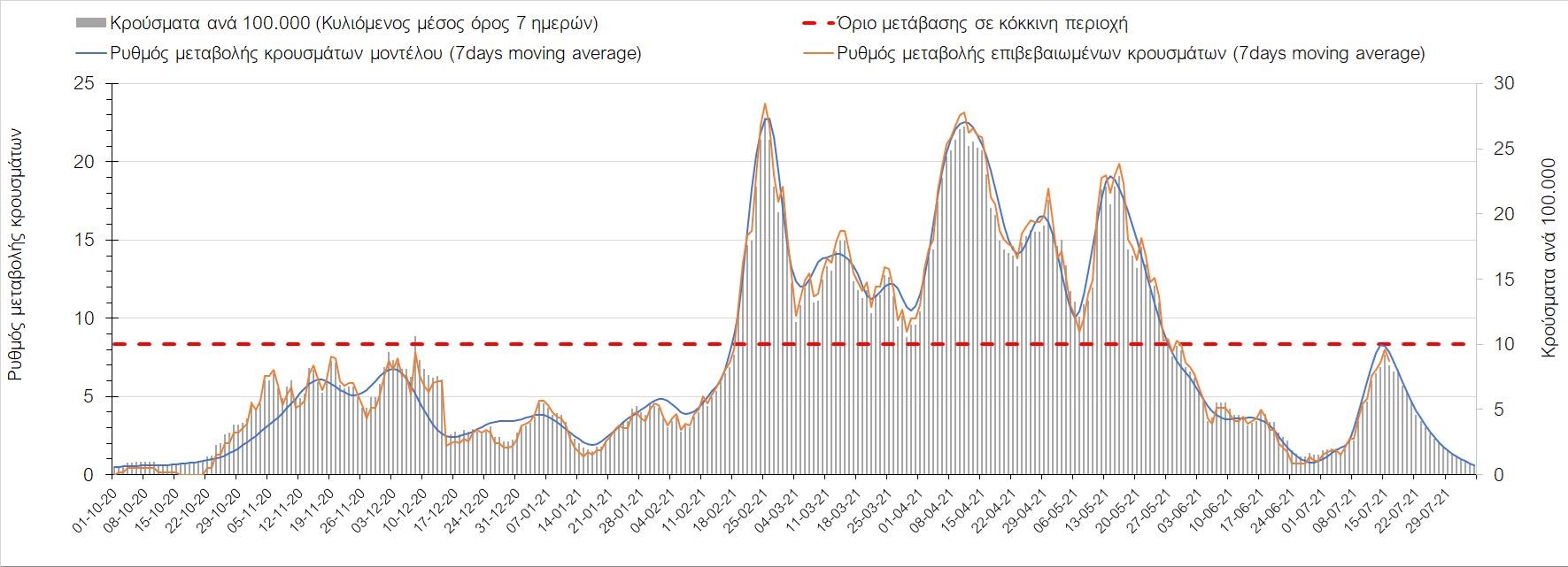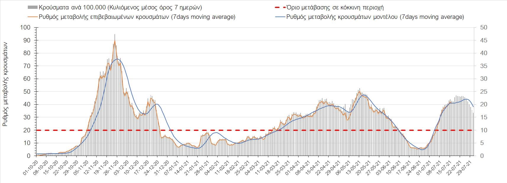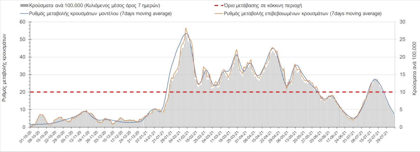 Η πορεία της μέσης εβδομαδιαίας τιμής των κρουσμάτων, καθώς και του κυλιόμενου μέσου όρου 7 ημερών του αριθμού των κρουσμάτων ανά 100.000 πληθυσμού, όπως έχουν καταγραφεί από τον ΕΟΔΥ και η αναμενόμενη πορεία τους όπως προδιαγράφεται από την υπολογιστική πλατφόρμα CORE για την Ελληνική επικράτεια μέχρι τις 31 Ιουλίου, αποτυπώνονται στο Σχήμα 4. Αυτή η προβλεπόμενη πορεία, που αφορά τα κρούσματα, τους νοσηλευόμενους σε απλές κλίνες, όσο και σε ΜΕΘ, καθώς επίσης και τους θανάτους, βασίζεται στις ακόλουθες παραδοχές: