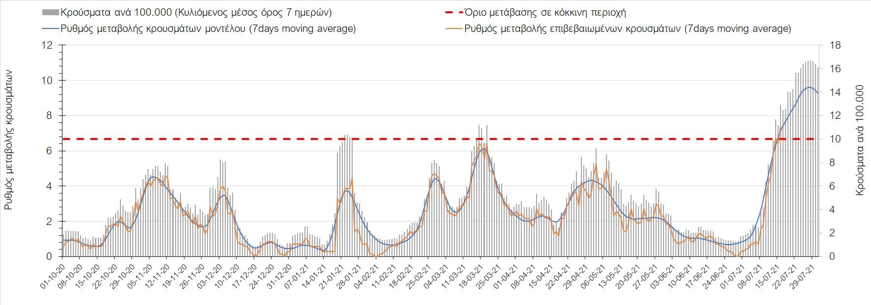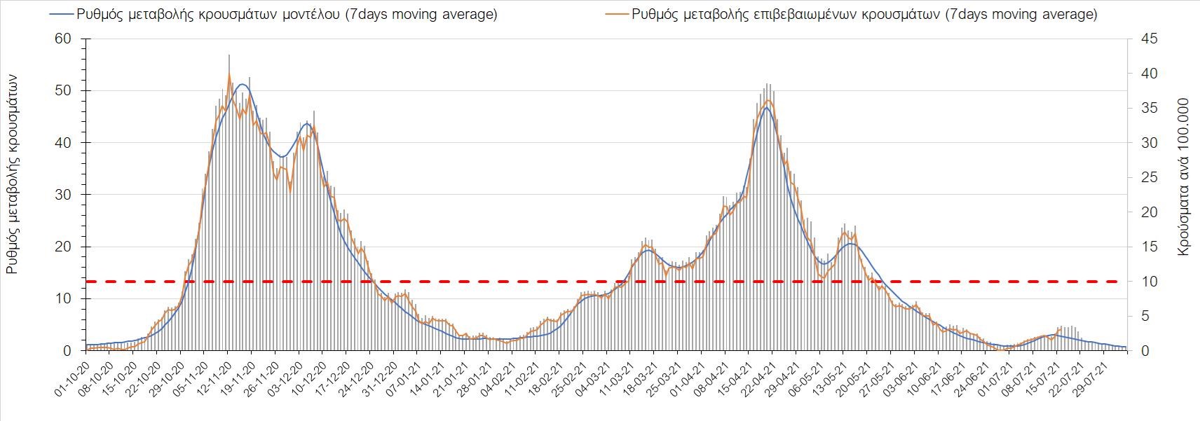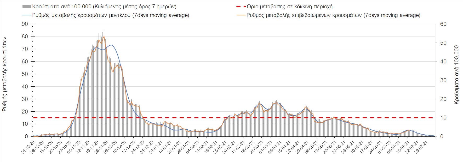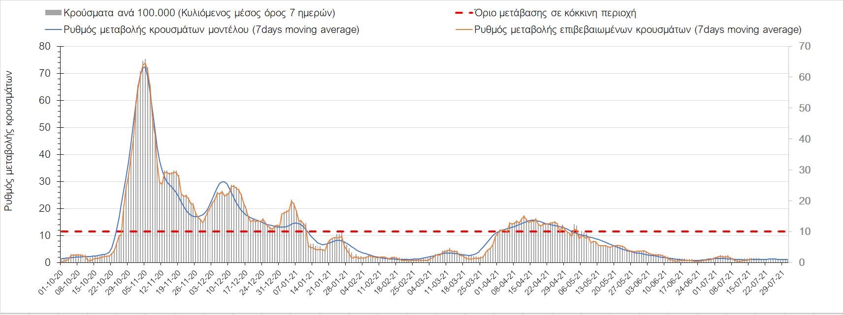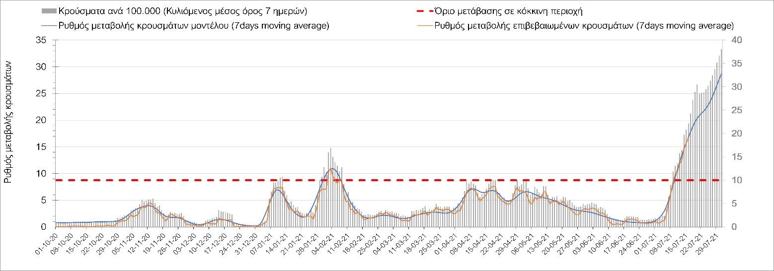 Η πορεία της μέσης εβδομαδιαίας τιμής των κρουσμάτων, καθώς και του κυλιόμενου μέσου όρου 7 ημερών του αριθμού των κρουσμάτων ανά 100.000 πληθυσμού, όπως έχουν καταγραφεί από τον ΕΟΔΥ και η αναμενόμενη πορεία τους όπως προδιαγράφεται από την υπολογιστική πλατφόρμα CORE για την Ελληνική επικράτεια μέχρι τις 31 Ιουλίου, αποτυπώνονται στο Σχήμα 4. Αυτή η προβλεπόμενη πορεία, που αφορά τα κρούσματα, τους νοσηλευόμενους σε απλές κλίνες, όσο και σε ΜΕΘ, καθώς επίσης και τους θανάτους, βασίζεται στις ακόλουθες παραδοχές: