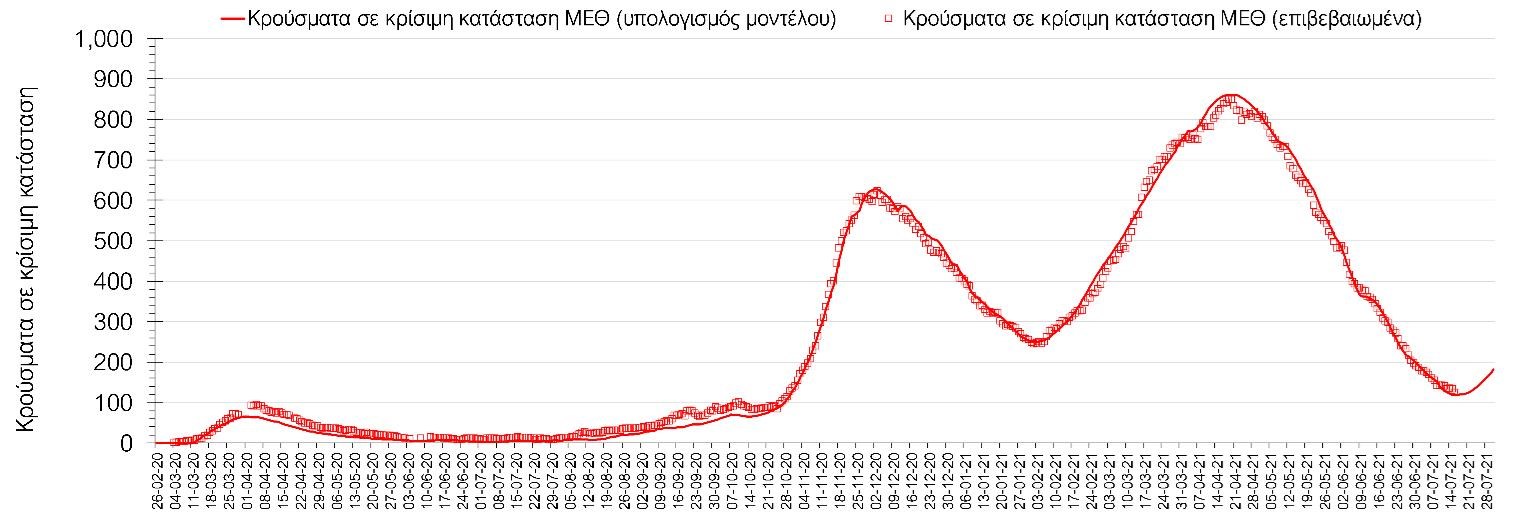 Όσον αφορά στους ασθενείς σε κρίσιμη κατάσταση (διασωληνωμένοι σε ΜΕΘ), ο αριθμός είναι μειωμένος σε σχέση με την Πέμπτη (123 από 132), και παρά τη σημαντική μείωση, πλέον βλέπουμε την (έστω ήπια) αναστροφή της πτώσης να συμβαίνει στη χρονική στιγμή που αναμέναμε. Η καμπύλη εξέλιξης του αριθμού των ασθενών που νοσηλεύονται σε κλίνες ΜΕΘ με βάση τις προσομοιώσεις της πλατφόρμας CORE, όπως αυτή παρουσιάζεται στο Σχήμα 1, των ασθενών που νοσηλεύονται σε απλές κλίνες στο Σχήμα 2 (όπου διαφαίνεται πλέον η αναμενόμενη αύξηση στις νοσηλείες), ενώ μια εκτίμηση για την πορεία των θανάτων ανά ημέρα παρουσιάζεται στο Σχήμα 3.